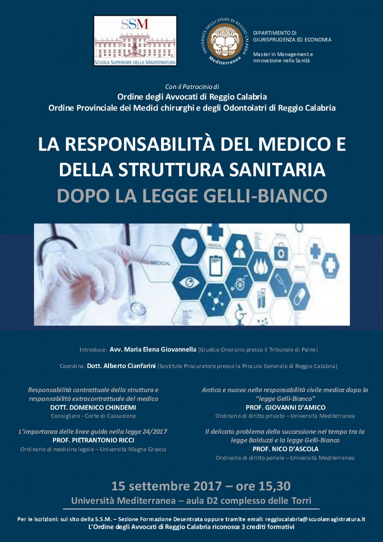 Il 15 settembre alle ore 15,30, aula D2 di Giurisprudenza (Salita Melissari), si svolgerà un convegno organizzato dalla scuola Superiore della Magistratura e dal Dipartimento di Giurisprudenza ed Economia, Master in Management e innovazione nella Sanità. Il tema, molto attuale, è La responsabilità della struttura sanitaria e del medico dopo la legge Gelli-Bianco.