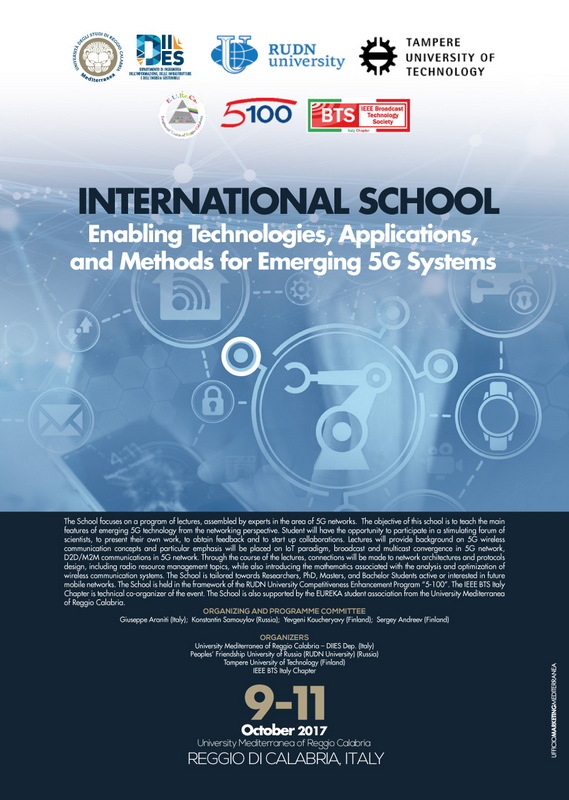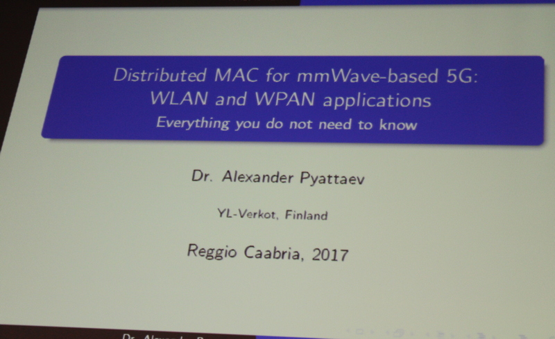 Dal 9 all’11 Ottobre hanno avuto luogo presso l’Università Mediterranea di Reggio Calabria (Ingegneria) due eventi scientifici internazionali di considerevole rilievo nell’ambito delle reti di comunicazione wireless di quinta generazione (5G): la prima scuola internazionale sul tema “Enabling Technologies, Applications, and Methods for Emerging 5G Systems” e l’11a edizione del workshop internazionale dal titolo “Applied Problems in Theory of Probabilities and Mathematical Statistics into Telecommunications (APTP+MS’2017) (Summer Session)”. Entrambe le iniziative sono frutto di una consolidata e proficua collaborazione scientifica tra il Dipartimento DIIES (Prof. Giuseppe Araniti), la RUDN University – Russia (Prof. Konstantin Samouylov), la Tampere University of Technology – Finlandia (Prof. Yevgeni Koucheryavy e Dr. Sergey Andreev), e il Federal Research Center “Computer Science and Control” of the Russian Academy of Sciences (Prof. Sergey Shorgin).Non è mancata la presenza delle aziende, tra cui Ericsson e Intel, leader nell’ambito dello sviluppo e della standardizzazione di sistemi avanzati di telecomunicazioni.