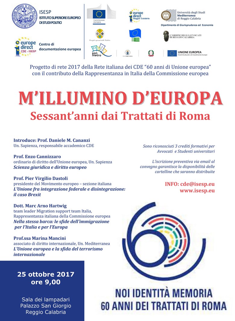 Anche quest'anno il CDE (Centro di documentazione europea) dell'ISESP (Istituto Superiore Europeo di Studi Politici) partecipa al Progetto della rete italiana dei CDE della Commissione europea, nella presente edizione, dedicato ai sessant'anni dai Trattati di Roma e che si svolge in collaborazione con l'Europe Direct di Reggio Calabria e con il patrocinio del Consiglio Regionale della Calabria, della Città Metropolitana di Reggio Calabria, del DiGiEc dell'Università Mediterranea, dell'Ordine degli Avvocati di Reggio Calabria, del Movimento europeo - sezione italiana.