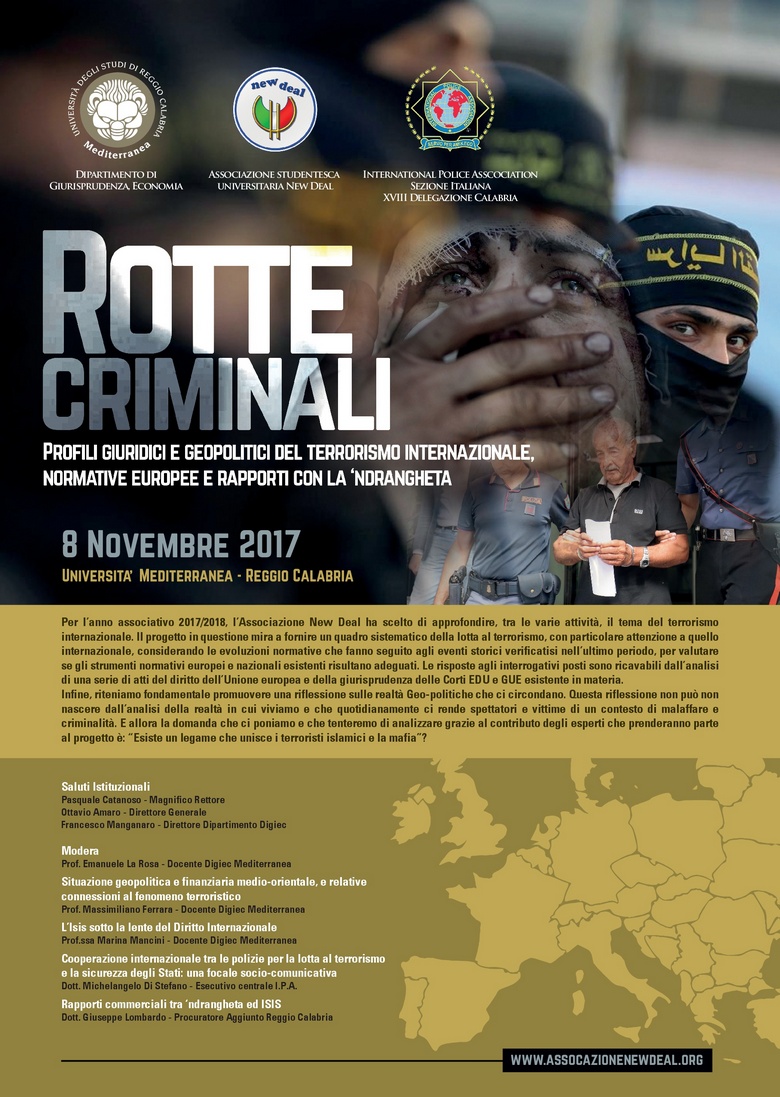 La New Deal, associazione giovanile che da anni punta ad aggregare e supportare gli studenti all’interno dell’Università Mediterranea, taglia i nastri di partenza del nuovo accademico con “Rotte Criminali”, un incontro formativo che andrà ad approfondire in modo strategico e puntuale temi sempre più dibattuti ed attuali: i profili giuridici e geopolitici del terrorismo internazionale, le normative europee e i rapporti con la ‘Ndrangheta, considerata l’organizzazione criminale più potente al mondo.