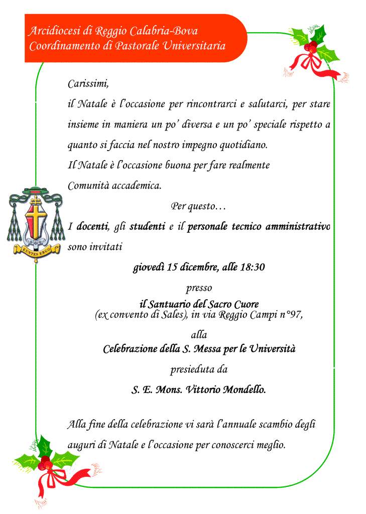 Giovedì 15 dicembre alle ore 18.30, presso il Santuario del Sacro Cuore (ex Convento di Sales) - Via Reggio Campi 97- si celebra la messa per l'Università. Presiede S.E. mons. Vittorio Mondello. Gli studenti ed il personale dell'Ateneo sono invitati a partecipare.