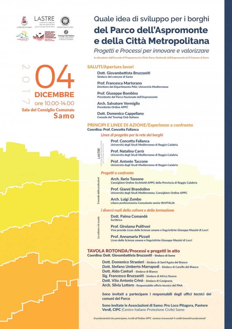 Mercoledì 4 dicembre si terrà a Samo, presso la sala del Consiglio Comunale, l’incontro promosso dal Laboratorio LASTRE (Laboratorio integrato dell’Area dello Stretto per lo sviluppo del territorio) del Dipartimento PAU, sul tema Quale idea di sviluppo per i borghi del Parco dell’Aspromonte e della Città Metropolitana. Progetti e Processi per innovare e valorizzare.