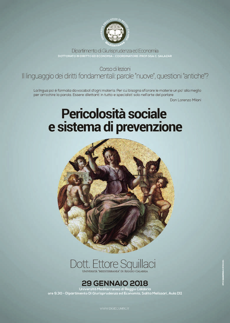 Riprendono le lezioni del dottorato in Diritto ed Economia del DIGiEC, coordinato dalla prof.ssa Carmela Salazar. Nel quadro del corso Il linguaggio dei diritti fondamentali. Parole "nuove", questioni "antiche"?, il 29 gennaio, alle ore 9.30, nell'Aula D11 del Dipartimento di Giurisprudenza ed Economia, il dott. Ettore Squillaci rifletterà su “Pericolosità sociale e sistema di prevenzione”.