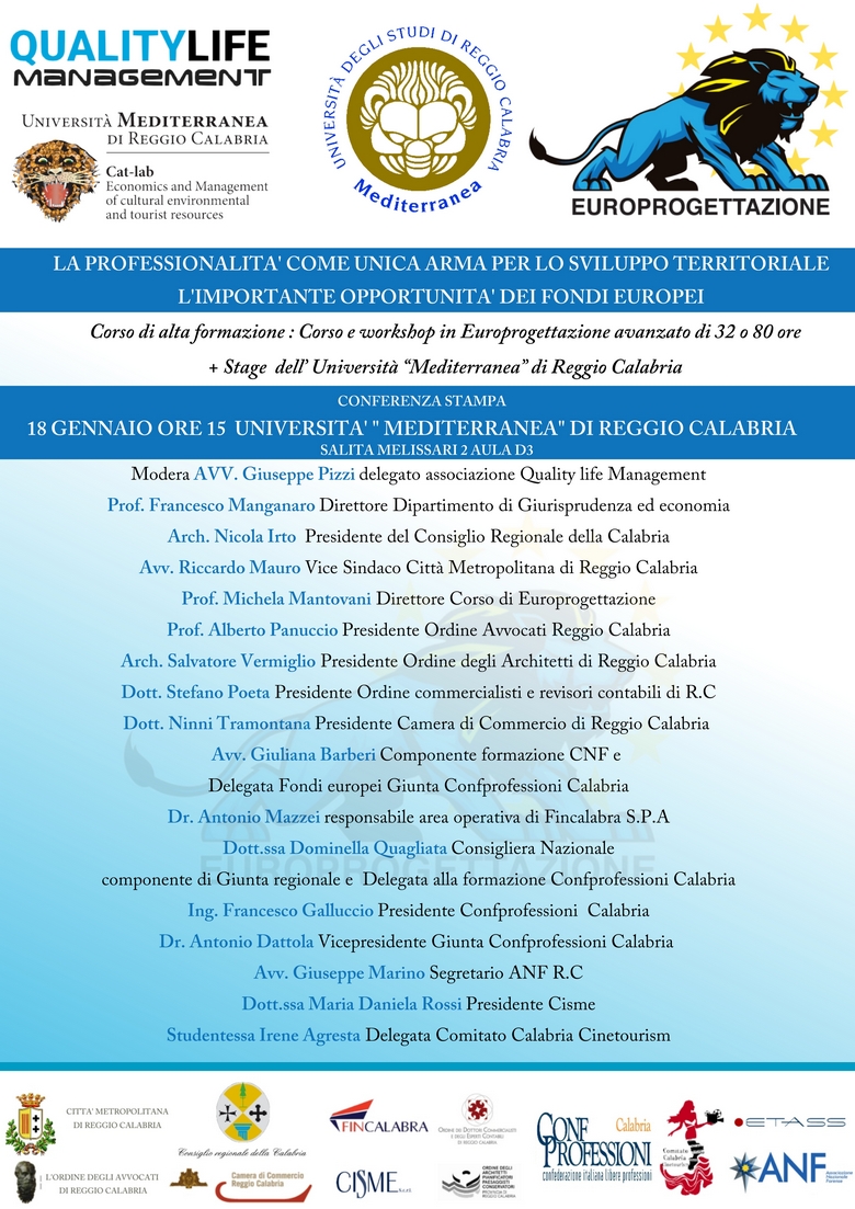 Il 18 gennaio alle ore 15 presso l’aula D3 dell’Università Mediterranea, sarà presentata la 4° edizione del Corso e workshop in Europrogettazione avanzato di 32 o 80 ore +stage.