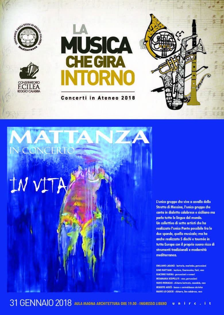 Il concerto di apertura è affidato ai Mattanza, storica formazione dell’area dello Stretto, che si esibiranno mercoledì 31 gennaio presso l’Aula Magna Ludovico Quaroni di Architettura.