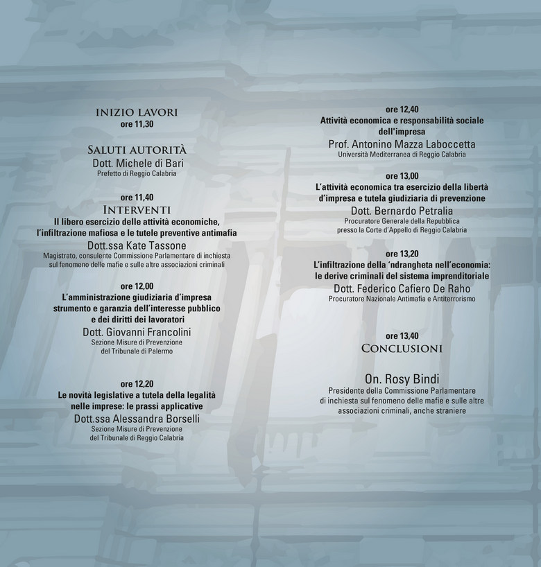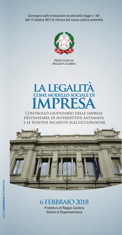 Martedì 6 febbraio, con inizio alle ore 11.30, nel Salone di rappresentanza della Prefettura - Piazza Italia, Reggio Calabria - si svolgerà il convegno sulle innovazioni recate dalla legge n. 161 del 17 ottobre 2017 di riforma del nuovo codice antimafia.