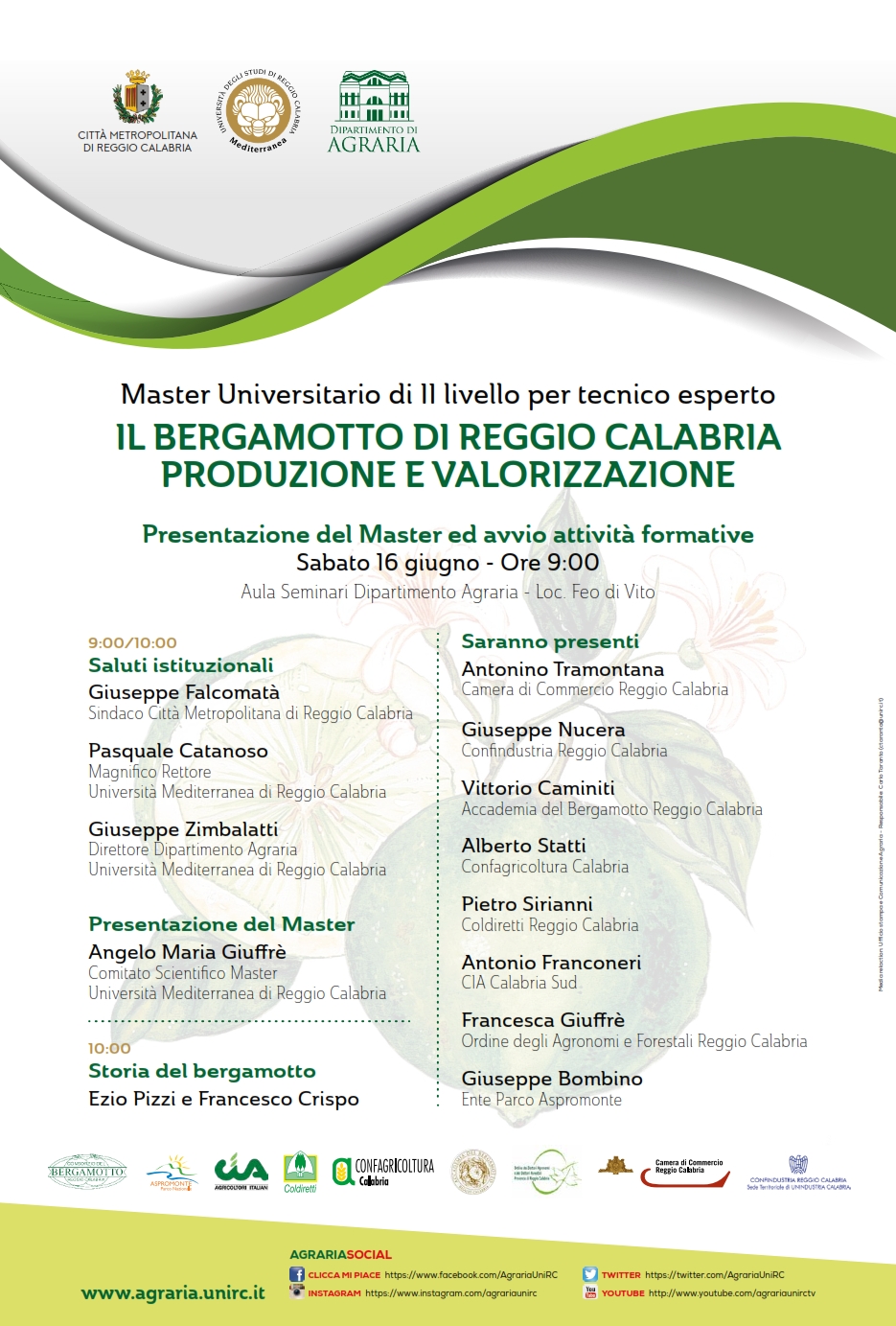 Il Dipartimento Agraria nell’ambito delle proprie attività di trasferimento tecnologico e di alta formazione, ha sottoscritto, con la Città Metropolitana di Reggio Calabria, la convenzione per la realizzazione di un Master di II livello per Tecnico Esperto su “Il bergamotto di Reggio Calabria. Produzione e valorizzazione”, rivolto a laureati magistrali.