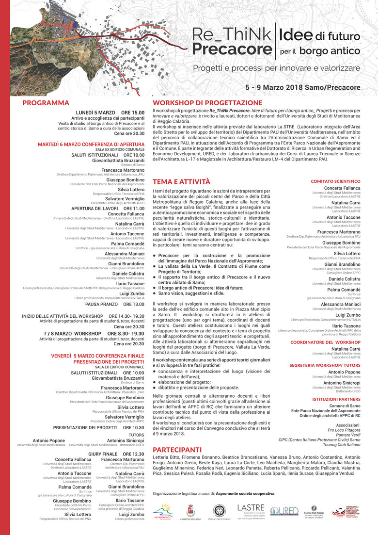 Si sono avviati a Samo i lavori del workshop di progettazione Re_ThiNk Precacore. Idee di futuro per il borgo antico_ Progetti e processi per innovare e valorizzare. Il workshop, ideato e condotto dal Laboratorio LaStre del Dipartimento PAU dell’Università Mediterranea (Resp. Scientifico prof.ssa C. Fallanca) è svolto nell’ambito del percorso di collaborazione tecnico scientifica tra l’Amministrazione Comunale di Samo ed il PAU, in attuazione dell’Accordo di Programma tra l’Ente Parco Nazionale dell’Aspromonte e il Comune. I lavori coinvolgono oltre trenta progettisti con competenze diverse: architetti, conservatori, ingegneri, agronomi e dottorandi e dottori di ricerca. Inoltre, professori della Mediterranea e liberi professionisti, forniranno un contributo di indirizzo anche grazie all’adesione all’iniziativa dell’ordine APPC di Reggio Calabria.