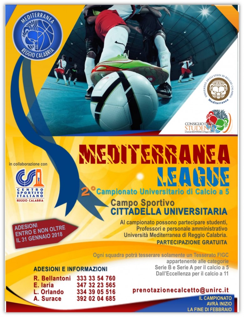 Al via il 12 marzo p.v. Mediterranea League, la seconda edizione del Campionato di calcio a 5 in Ateneo, organizzato dal Centro Fitness in collaborazione con il Consiglio degli studenti e CSI.