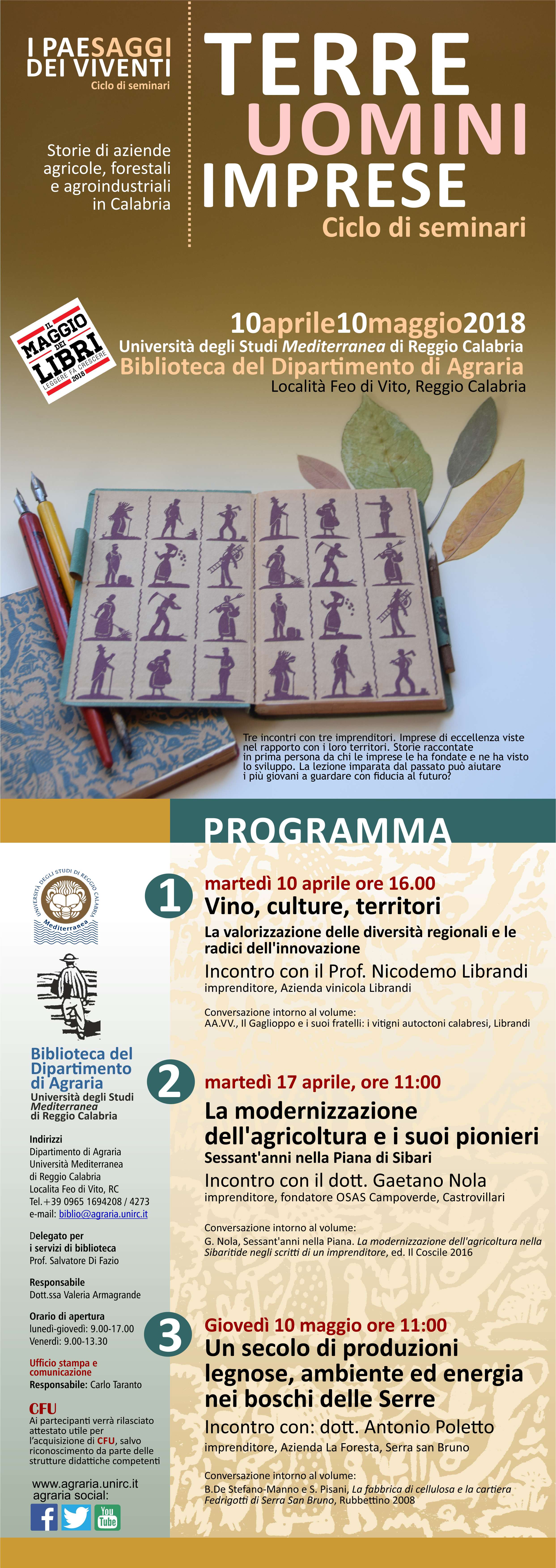 Dal 10 Aprile al 10 maggio 2018, promosso dalla Biblioteca del Dipartimento di Agraria dell’Università Mediterranea di Reggio Calabria, si svolgerà un ciclo di Seminari sul tema “Terre, Uomini, Imprese” nel quale si percorreranno, insieme ai protagonisti, le storie di aziende agricole, forestali e agroindustriali che hanno avuto un ruolo determinante per lo sviluppo di interi territori della Calabria.