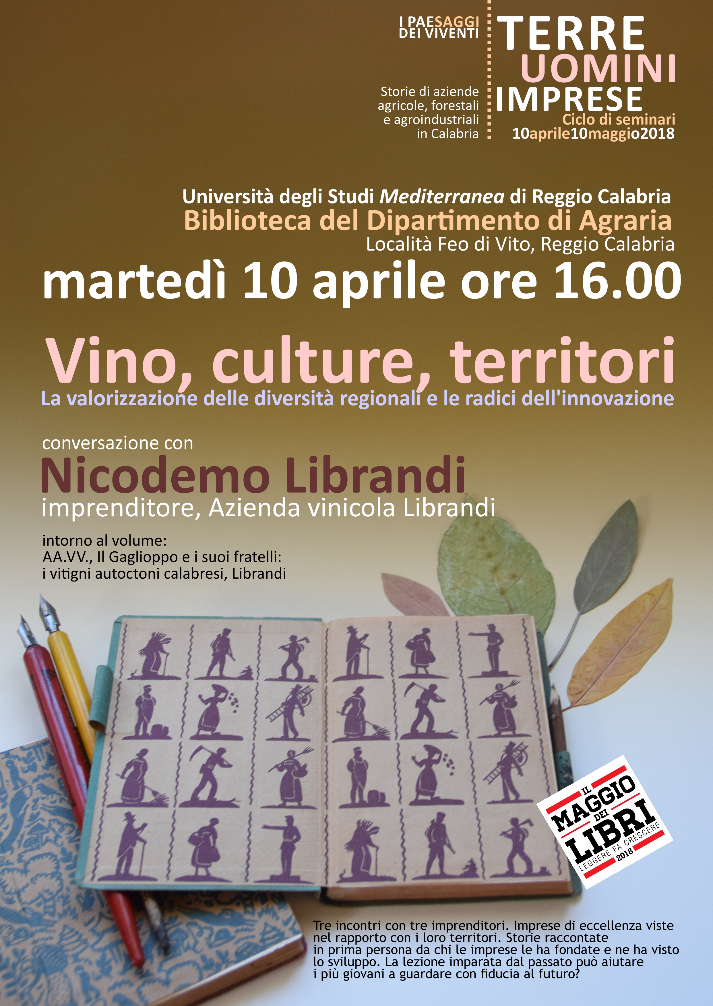 Martedì 10 aprile alle ore 16 Nicodemo Librandi sarà ospite della Biblioteca del Dipartimento di Agraria dell’Università Mediterranea di Reggio Calabria per una conversazione sul tema “Vino, culture, territori: la valorizzazione delle diversità regionali e le radici dell’innovazione”. Il seminario si colloca all’interno del ciclo “Terre, uomi, imprese”, nel quale vengono proposti incontri con imprenditori che in qualche modo hanno segnato la storia dello sviluppo agricolo, forestale e agroindustriale della Calabria. Tra essi, Antonio e Nicodemo Librandi con la loro azienda, perseguendo l’eccellenza vinicola, da anni sono impegnati nella valorizzazione dei vitigni autoctoni calabresi: attività di ricerca, conservazione della biodiversità viticola, innovazione tecnologica. Con altre imprese vitivinicole hanno dato luogo alla rete di EuVite, condividendo la stessa filosofia aziendale, la diffusione di buone pratiche, la promozione delle produzioni vitivinicole calabresi di qualità, la valorizzazione del patrimonio paesaggistico, storico e culturale presente nei territori di produzione.