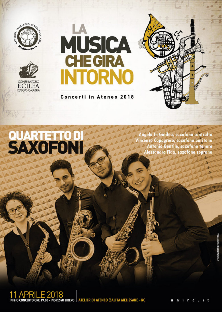 Per "La Musica che gira intorno", mercoledì 11 aprile presso l'Atelier di Architettura - Cittadella Universitaria alle 19.00, l'esibizione del Quartetto di Saxofoni con Angela In Galilea, Vincenzo Capogreco, Antonio Gentile e Alessandro Fida.