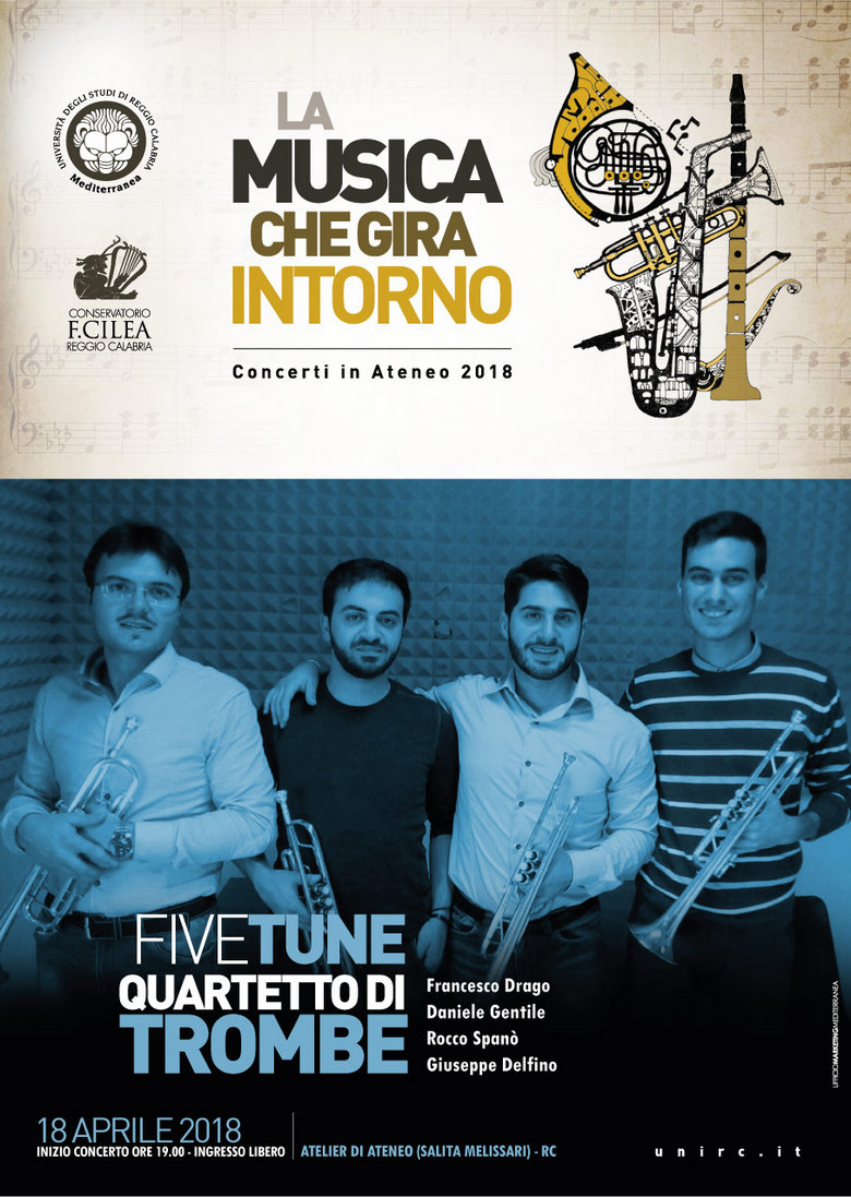 Per "La Musica che gira intorno", mercoledì 18 aprile presso l'Atelier di Architettura - Cittadella Universitaria alle 19.00, l'esibizione del quartetto di trombe Five Tune: Francesco Drago, Daniele Gentile, Rocco Spanò e Giuseppe Delfino.