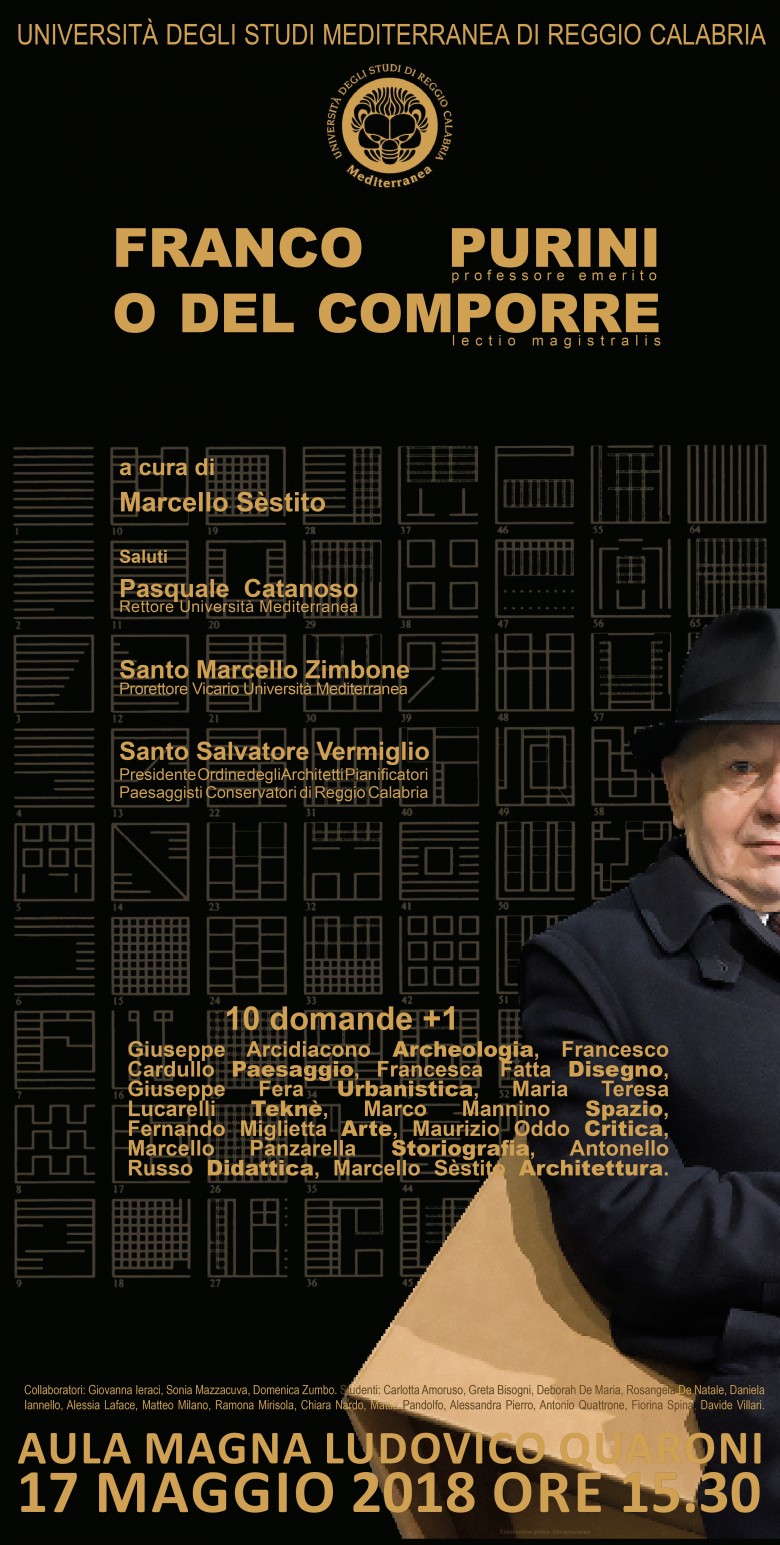 Il 17 maggio ore 15.30 si è tenuto un incontro presso l’Aula Magna Ludovico Quaroni dell’Università Mediterranea di Reggio Calabria, curato dal prof. Marcello Sèstito, per la lectio magistralis del professore emerito Franco Purini, architetto di fama mondiale che tanto ha dato nei suoi anni di insegnamento alla Facoltà di Architettura di Reggio Calabria, in anni di forte fermento intellettuale coinvolgendo non solo gli studenti ma l’intero corpo dei docenti che molto devono per lo svolgimento della didattica al suo insegnamento.