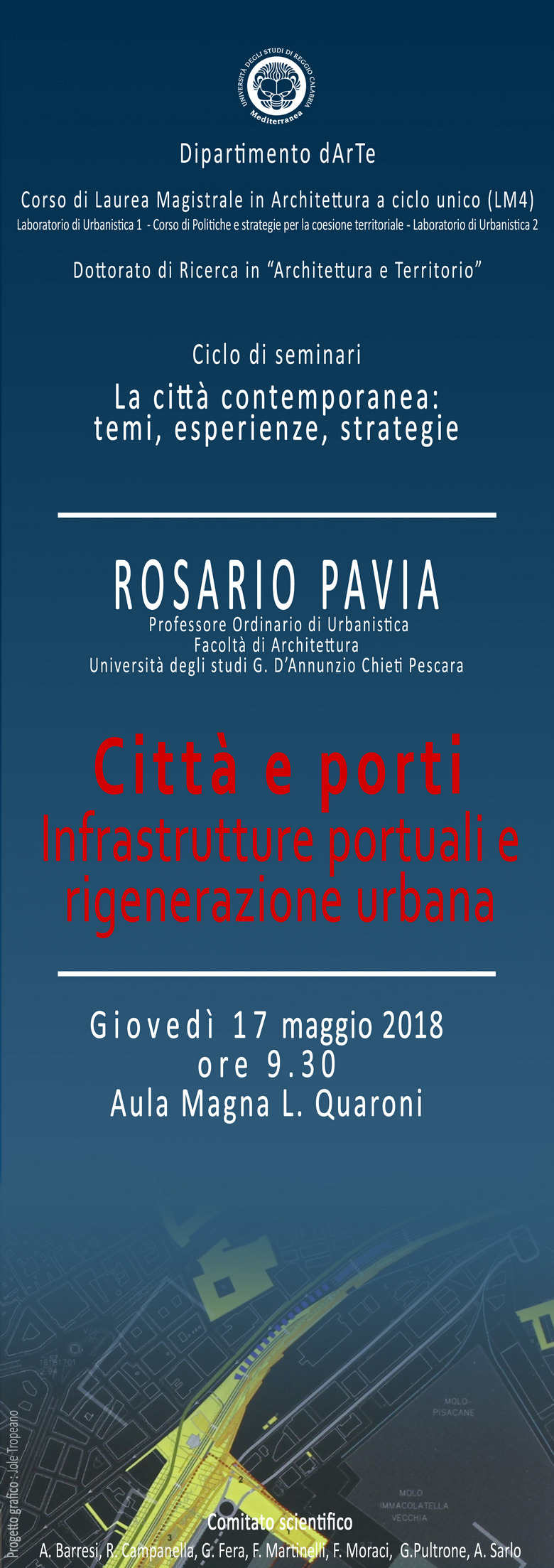 Il 17 maggio 2018 alle ore 9,30 presso l’Aula Magna Ludovico Quaroni, Rosario PAVIA, Professore Ordinario di Teoria dell’Urbanistica presso il Dipartimento di Architettura dell’Università degli Studi di Pescara, terrà il seminario “Città e porti. Infrastrutture portuali e rigenerazione urbana”.