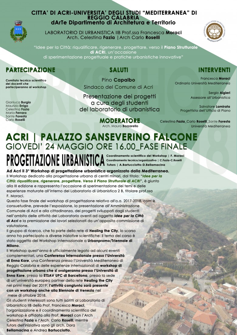 La fase finale del workshop di progettazione relativo all'a.a. 2017-2018, com’è consuetudine, prevede l’esposizione, la presentazione all’Amministrazione Comunale di Acri e alla cittadinanza, dei progetti - sviluppati dagli studenti nell’ambito delle attività del Laboratorio - aventi ad oggetto Idee per la Città di Acri e la premiazione dei lavori selezionati da un’apposita commissione di valutazione.