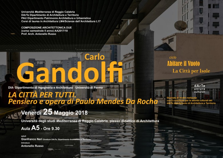 Carlo Gandolfi articolerà una comunicazione rivolta a tutti gli studenti di architettura dal titolo La città per tutti. Pensiero e opera di Paulo Mendes Da Rocha.