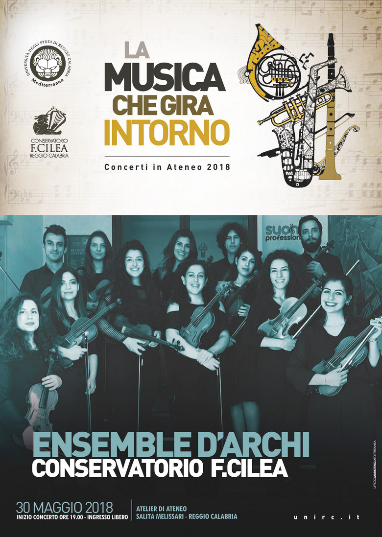 Per il ciclo "La Musica che gira intorno", mercoledì 30 maggio dalle 19.00 nell'Atelier di Architettura, il concerto dell'Ensemble d'Archi del Conservatorio F. Cilea.