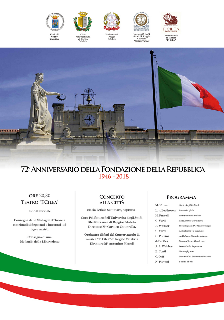 Il 2 giugno alle ore 10.00, presso il Monumento ai Caduti sito sul Corso Vittorio Emanuele III avranno inizio i festeggiamenti per la celebrazione del 72° Anniversario della Fondazione della Repubblica Italiana. La manifestazione mattutina vedrà lo svolgimento della cerimonia dell’Alzabandiera, la tradizionale deposizione della corona d’alloro, nonché la lettura, da parte del prefetto Michele di Bari, del messaggio del Presidente della Repubblica.
