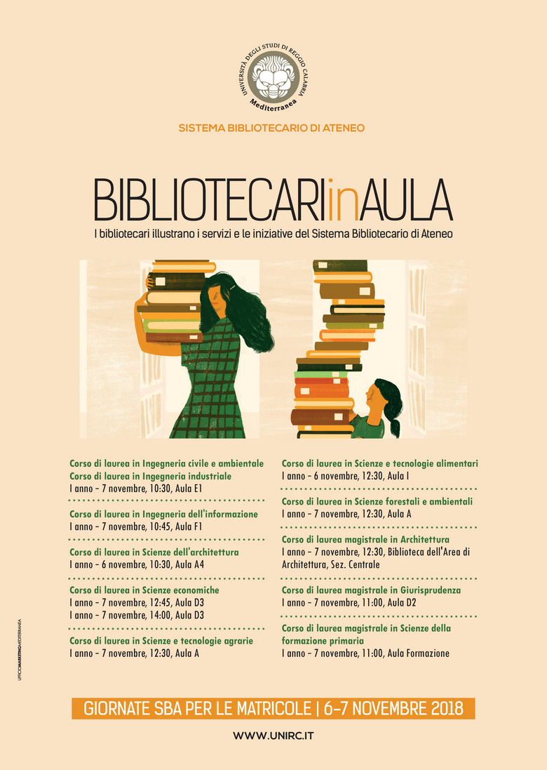 I responsabili delle Biblioteche illustreranno i servizi e le iniziative del Sistema Bibliotecario di Ateneo agli studenti del I anno di tutti i corsi di laurea, intervenendo in uno spazio dedicato delle lezioni.