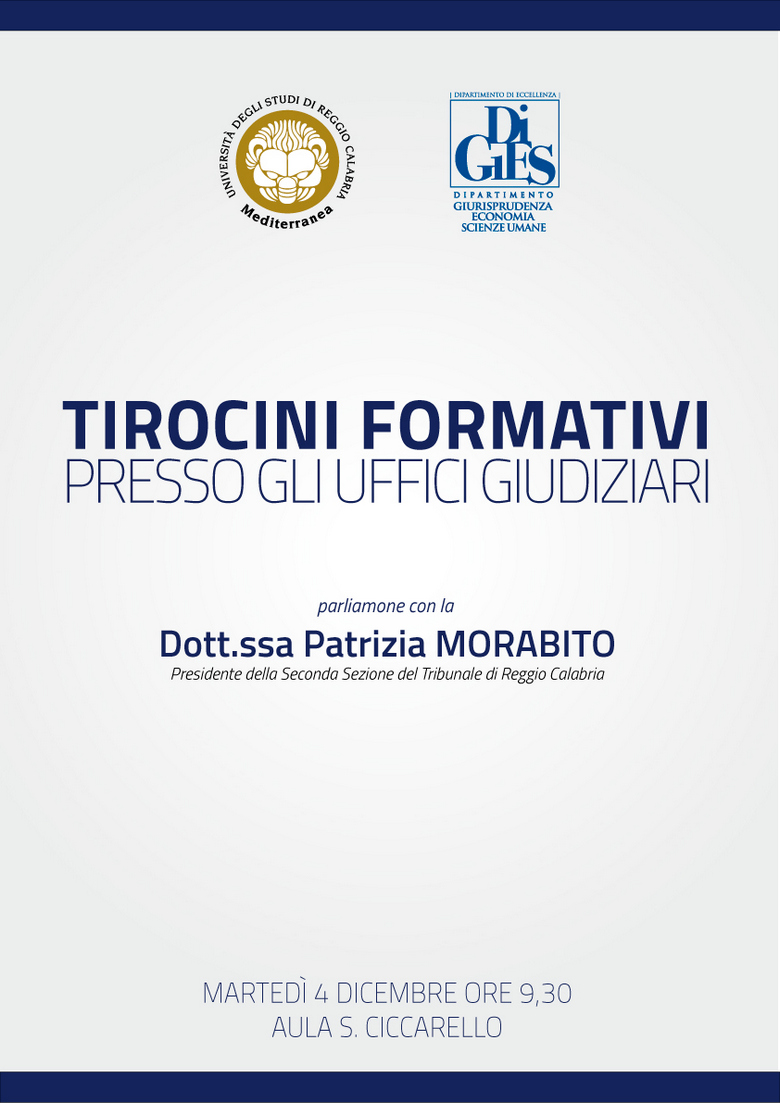 Martedì 4 dicembre alle ore 9.30 presso l’Aula Sebastiano Ciccarello (lotto D) la dott.ssa Patrizia Morabito – Presidente della seconda sezione del Tribunale di Reggio Calabria - illustrerà i tirocini formativi post laurea [ex art 73 dl 69 del 2013] che è possibile svolgere presso gli uffici giudiziari.