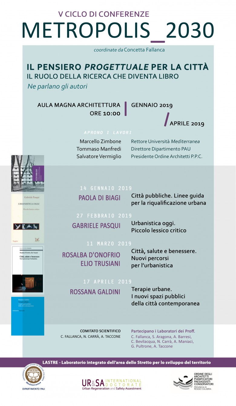 Il ciclo di conferenze è organizzato dal Lastre (Laboratorio dell’Area dello Stretto per lo Sviluppo del Territorio) del Dipartimento PAU (Patrimonio, Architettura, urbanistica) dell’Università Mediterranea di Reggio Calabria, congiuntamente al Corso di Studi L17 Scienze dell’Architettura, al corso di studi LM4 Architettura Restauro, al Dottorato di ricerca Urban Regeneration and Safety Assestment e all’Ordine degli Architetti, Pianificatori, Paesaggisti e Conservatori della Provincia di Reggio Calabria.