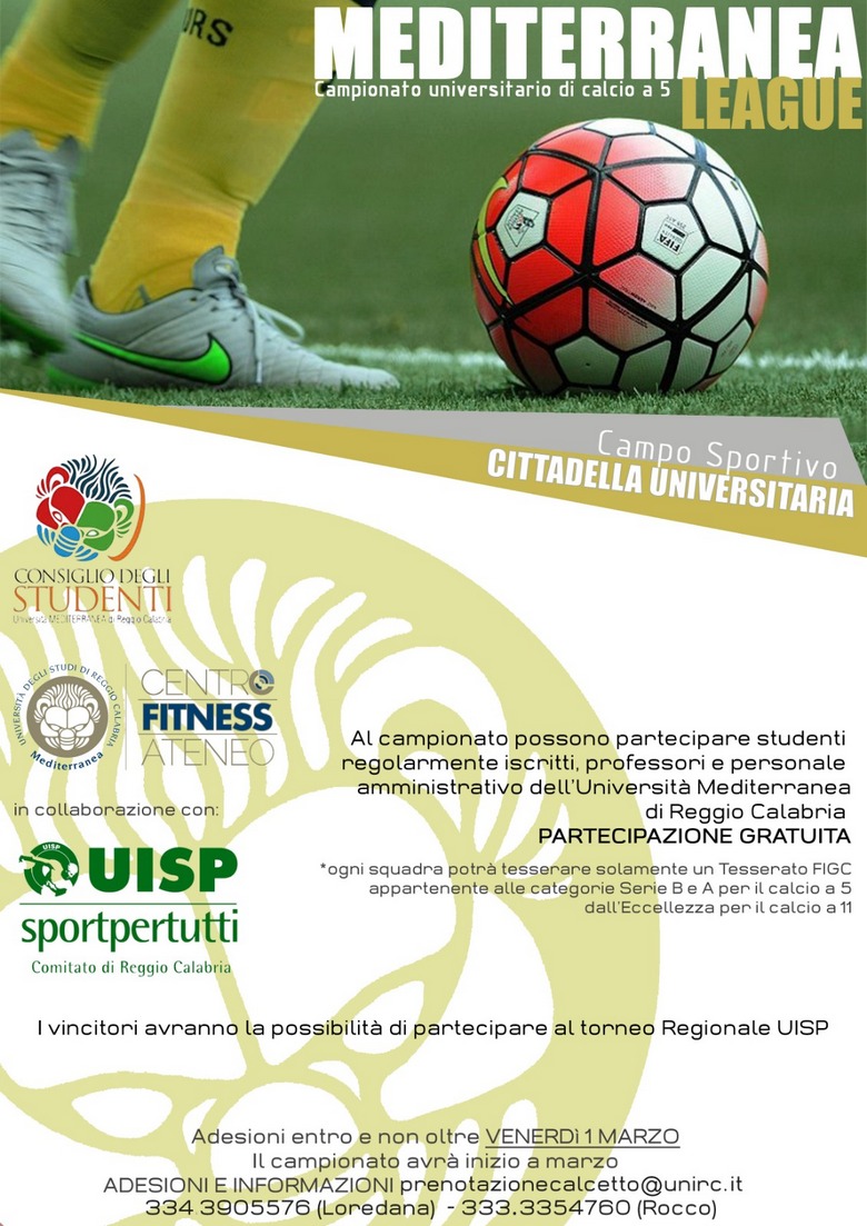 Per il terzo anno consecutivo con grande piacere comunichiamo che sono ufficialmente aperte le iscrizioni alla terza edizione del Mediterranea League, il Campionato Universitario di Calcio a 5 dell'Università degli studi Mediterranea di Reggio Calabria.