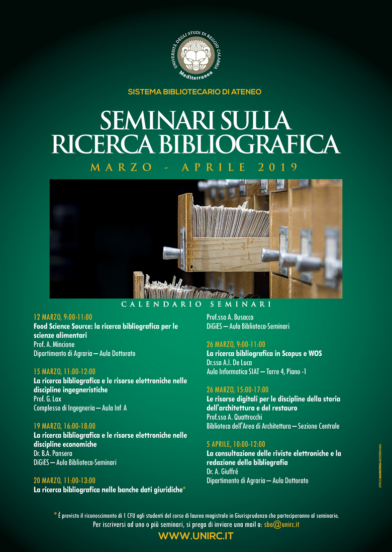 Il Sistema Bibliotecario di Ateneo ha organizzato il terzo ciclo di seminari sulla ricerca bibliografica, che si svolgerà nei mesi di marzo e aprile 2019.