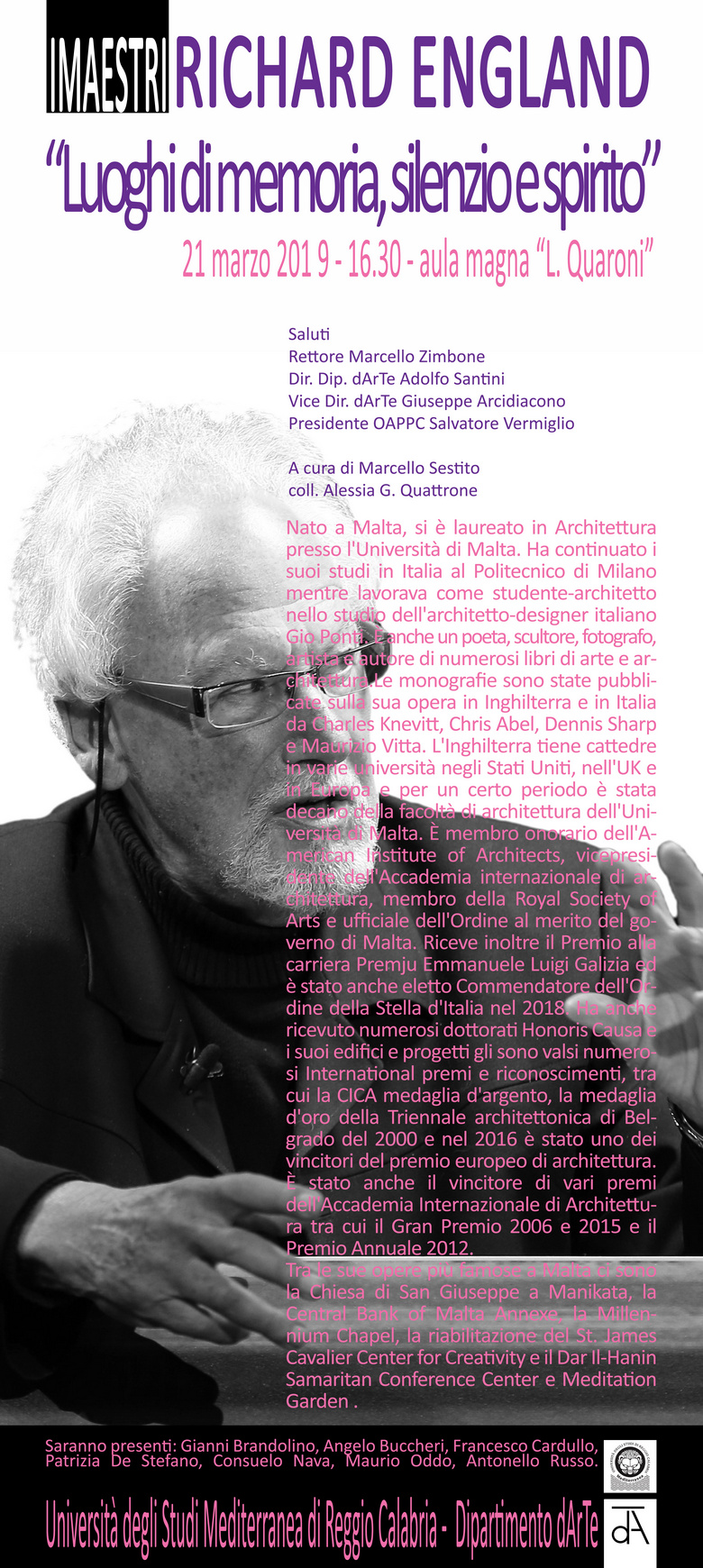 Al pari di architetti come Ridolfi per Terni, o Michelucci per Firenze, Giancarlo De Carlo per Urbino, che hanno fatto coincidere il loro lavoro con le terre che calpestavano, Richard detiene le chiavi di questa casa galleggiante-MALTA- circondata dal Mediterraneo e in essa almeno tre atteggiamenti progettuali tendono a delineare il suo operare: