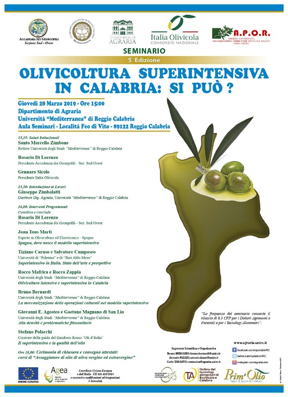 Ma tale modello può essere utilizzato con successo anche in Calabria? Quali solo le opportunità che esso offre, ma soprattutto, siamo ancora in tempo per coglierle? Questi sono gli interrogativi ai quali la Sezione Sud-Ovest dell’Accademia dei Georgofili, con Italia Olivicola, Prim’Olio, oltre che con il Dipartimento di Agraria, intende iniziare a rispondere con il presente seminario.