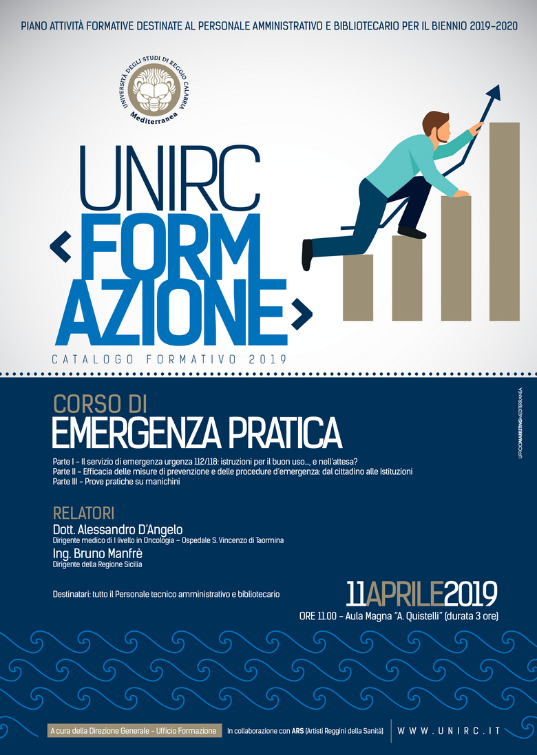 Giovedì 11 aprile 2019, alle ore 11.00, presso l'Aula Magna A. Quistelli, si terrà il Corso di formazione in “Emergenza pratica”, organizzato dalla Direzione Generale - Ufficio formazione, in collaborazione con ARS (Artisti Reggini della Sanità) e rivolto a tutto il personale tecnico amministrativo e bibliotecario di Ateneo.