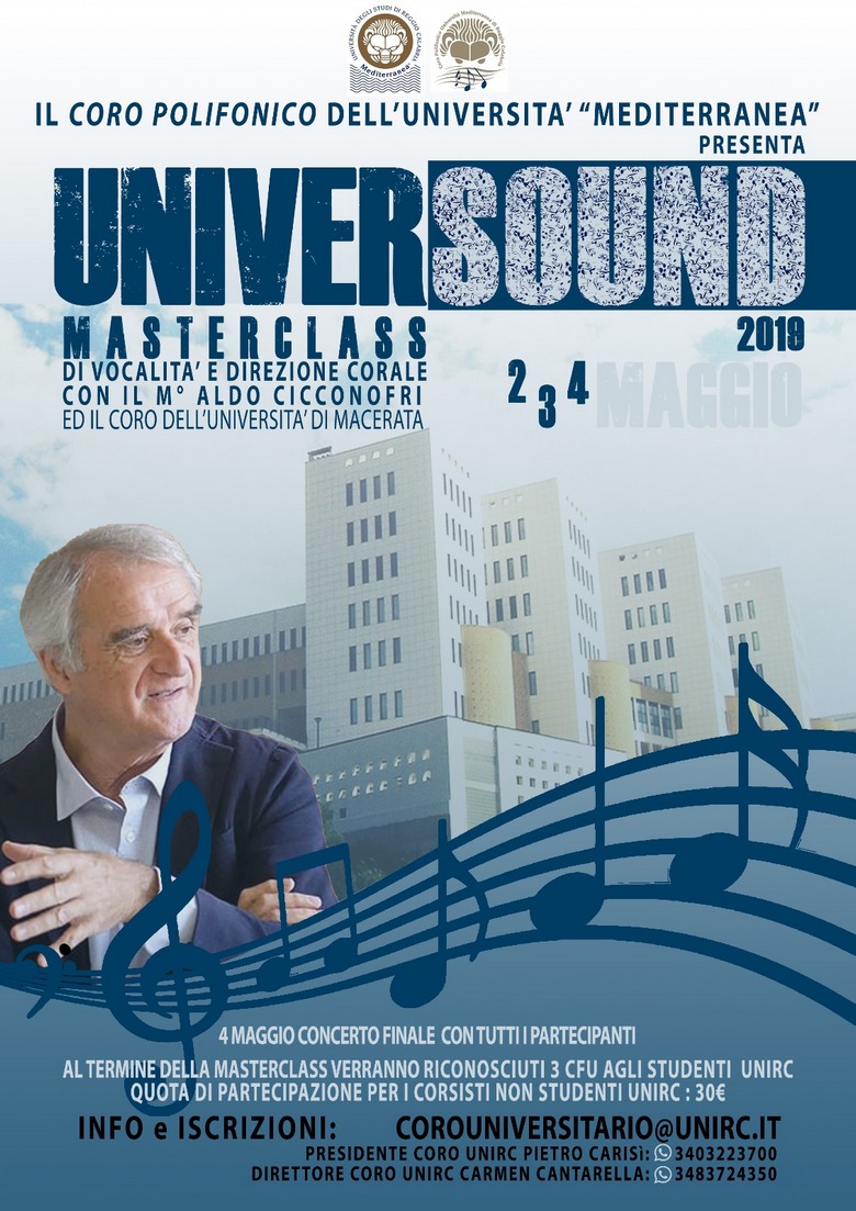 Il 2, 3 e 4 maggio il Coro Polifonico dell'Università Mediterranea, organizza con il patrocinio della CRUI, la Masterclass di canto e direzione corale “UNIVERSOUND” tenuta dal M° Aldo Cicconofri, eminente nome nel panorama corale italiano. La Masterclass, aperta gratuitamente a tutti gli studenti Unirc che vorranno partecipare, avrà inoltre come ospiti i Cori delle Università di Macerata e di Messina, proponendosi di diventare un punto di riferimento per il canto corale universitario del Meridione.