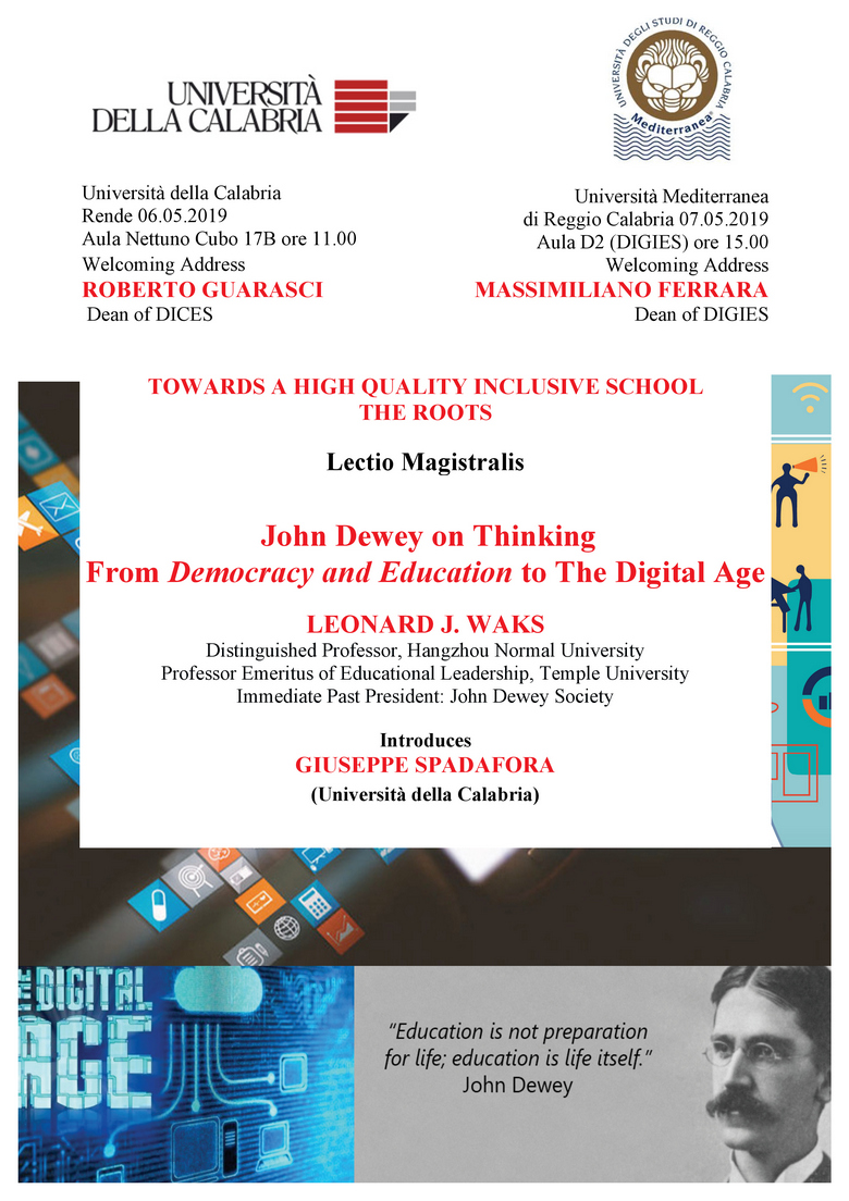 In questo contesto l’opera di Leonard J. Waks, uno dei maggiori studiosi al mondo del pensiero pedagogico di John Dewey, è fondamentale in quanto analizza la pedagogia di Dewey mettendola in relazione con le tematiche contemporanee della ricerca pedagogica e didattica. In questo contributo il pedagogista americano tenterà di dimostrare come la pedagogia deweyana, che fonda la scuola democratica contemporanea legandola alla costruzione della democrazia (la scuola è il laboratorio della democrazia), può essere sviluppata nell’ambito della era digitale che stiamo vivendo.