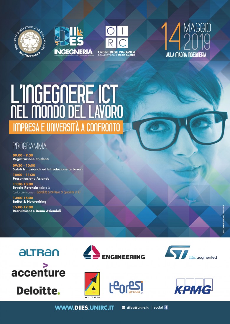 L’evento, organizzato dal DIIES (Dipartimento dell’Ingegneria dell’Informazione, delle Infrastrutture e dell’Energia Sostenibile) con il patrocinio dell'Ordine degli Ingegneri della Provincia di Reggio Calabria, vedrà la partecipazione di importanti stakeholder del mondo delle imprese ICT, quali Accenture, Alten, Altran, Deloitte, Engineering, KPMG, ST-Microelectronics, e Teoresi, e sarà moderata da Celia Guimaraes, giornalista di RAI News 24, specialista nel settore ICT.