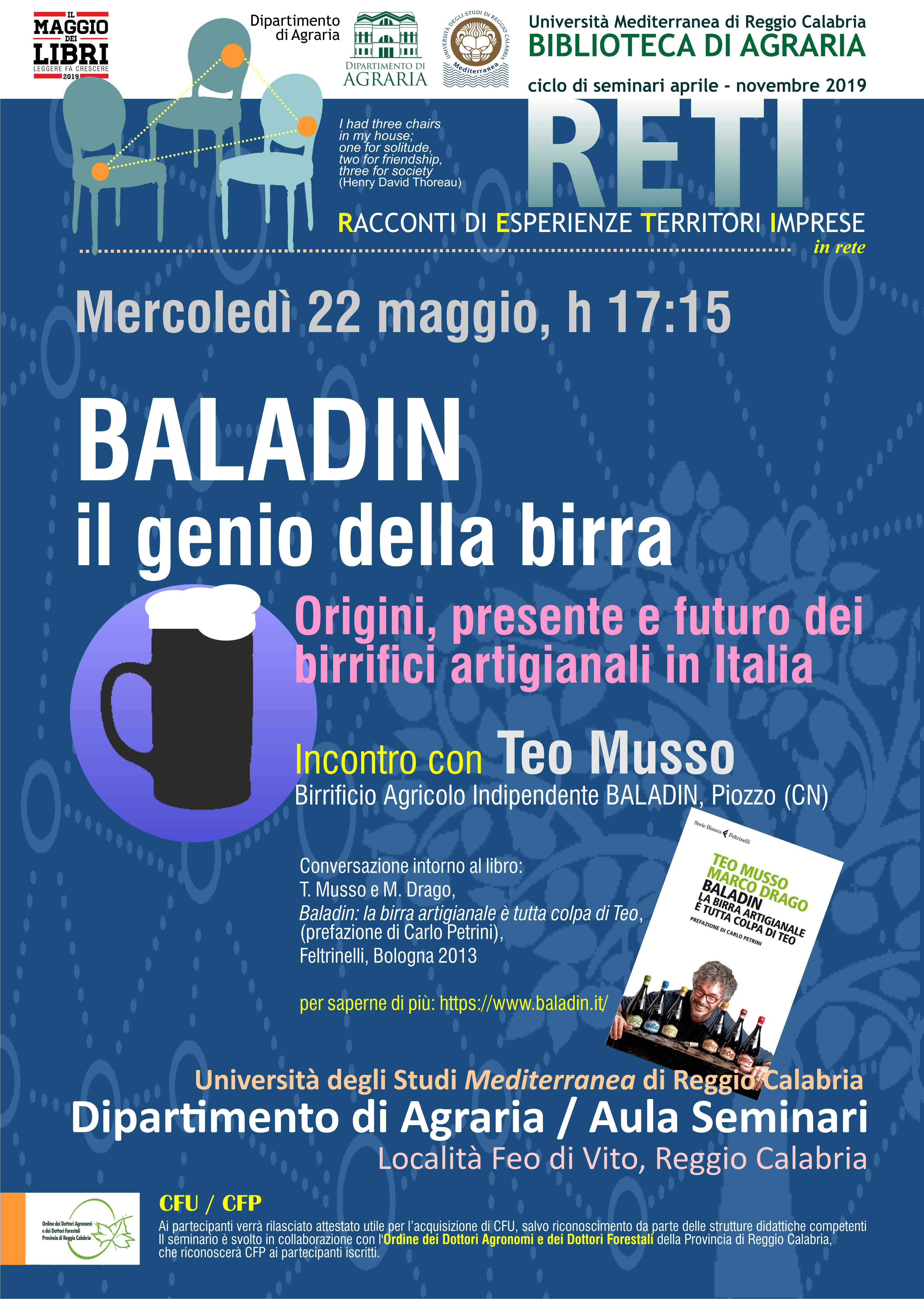Mercoledì 22 maggio 2019 alle ore 17.30 avrà luogo il terzo incontro del ciclo “RETI: Racconti di Esperienze, Territori, Imprese”, promosso dalla Biblioteca del Dipartimento di Agraria dell’Università Mediterranea di Reggio Calabria (località Feo di Vito). Titolo del seminario è “Baladin, il genio della birra. Origini, presente e futuro dei birrifici artigianali in Italia”. Interverrà Teo Musso, fondatore in Piemonte del Birrificio agricolo indipendente Baladin (Piozzo, CN). Musso è personaggio stimato e apprezzato in tutto il mondo per la creatività, la competenza e gli eccezionali risultati con cui si è dedicato alla produzione di birra, dando avvio da pioniere a una vera e propria rete nazionale di birrifici artigianali. La storia di Teo è divenuta recentemente un libro-intervista pubblicato da Feltrinelli (“Baladin: la birra artigianale è tutta colpa di Teo”) con la prefazione di Carlo Petrini, il fondatore di Slow Food. Dal gennaio 2012 il birrificio Baladin gestisce l’intero ciclo di produzione delle proprie birre, partendo proprio dalla terra e dalle materie prime. Il luppolo viene prodotto in campi dedicati anche ad attività sperimentali, mentre da 400 ha di campi d’orzo siti in Basilicata e nelle Marche vengono coperte le necessità per il malto di base. Il nuovo stabilimento (2016) sorge in un’area agricola che era da tempo abbandonata, con il recupero della cascina e dei capannoni presenti. All’interno, un impianto della capacità di 50.000 ettolitri/anno, tecnologicamente avanzato e realizzato da sole aziende italiane, consente di produrre in alta qualità “birra viva”. Teo Musso collabora inoltre con diverse sedi universitarie italiane. Lo scorso anno, nell’ambito di un progetto didattico dell’Università di Udine, Baladin ha supportato gli studenti nella produzione della prima “birra universitaria”, dai campi all’imbottigliamento. Il successo di Teo è legato anche alla creazione di una bella squadra di collaborazione: una rete di giovani che da tutta Italia hanno aderito alla condivisione di un lavoro, un percorso, filosofia di vita.