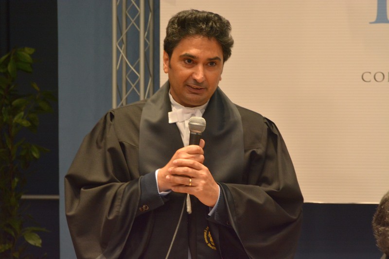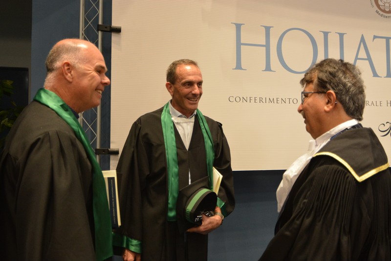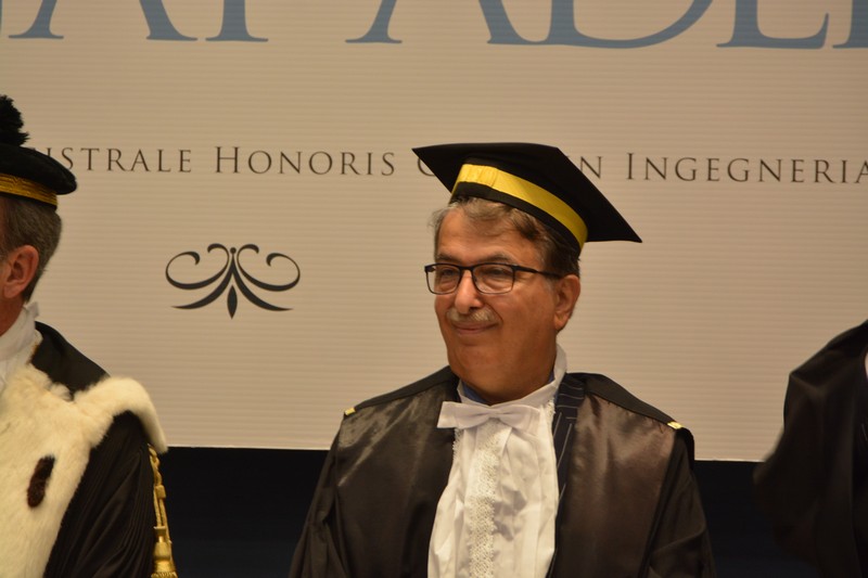 Il rettore, Santo Marcello Zimbone, presidente della Commissione di laurea, ha consegnato la pergamena di laurea magistrale in Ingegneria Civile ad honorem, in riconoscimento della straordinaria competenza interdisciplinare nel campo dell’Ingegneria che ne fa un modello di ingegnere evoluto, in cui la forte competenza settoriale non limita le competenze di carattere generale: singolare scienziato che ha raggiunto risultati rilevanti in quasi tutti gli ambiti dell’Ingegneria, dal Civile all’Industriale, alla Biomedica e all’Informazione.