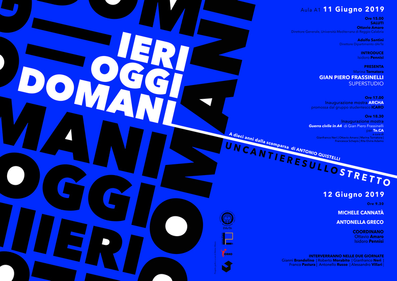 "IERI OGGI DOMANI _ Un cantiere sullo Stretto" è una iniziativa promossa dal Dipartimento Architettura e Territorio (dArTe) dell’Università Mediterranea di Reggio Calabria, in occasione del decimo anno dalla scomparsa di Antonio Quistelli.
