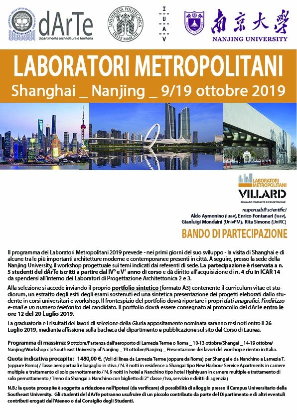 Il programma dei Laboratori Metropolitani 2019 prevede - nei primi giorni del suo sviluppo - la visita di Shanghai e di alcune tra le più importanti architetture moderne e contemporanee presenti in città. A seguire, presso la sede della Nanjing University, il workshop progettuale sui temi indicati dai referenti di sede. La partecipazione è riservata a n. 5 studenti del dArTe iscritti a partire dal IV° e V° anno di corso e dà diritto all’acquisizione di n. 4 cfu in ICAR 14 da spendersi all’interno dei Laboratori di Progettazione Architettonica 2 e 3.