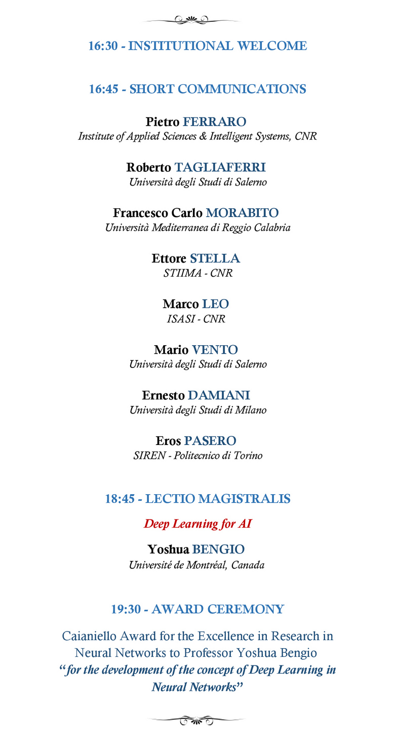 Il 28 giugno si terrà a Vietri sul MAre la consegna del Premio Caianiello 2019 al prof. Yoshua Bengio (Università di Montrèal).