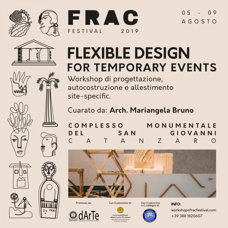 Frac Festival 2019 | Flexible Design for Temporary Events è la prima edizione di un workshop di progettazione site-specific promosso dal Dipartimento di Architettura e Territorio dell’Università Mediterranea di Reggio Calabria in collaborazione con il Dipartimento di Giurisprudenza, Economia e Sociologia dell’Università Magna Graecia di Catanzaro e con il sostegno della Fondazione Università Magna Graecia. Il workshop si inserisce all’interno delle attività del Frac Festival 2019, quest’anno alla sua quinta edizione.