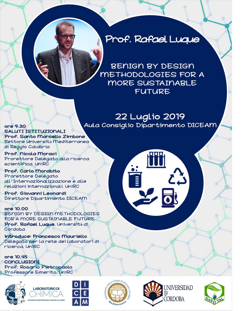 Il 22 Luglio 2019, presso l’Aula del Consiglio del Dipartimento DICEAM, il prof. Rafael Luque terrà un seminario dal titolo “Benign by design methodologies for a more sustainable future”.