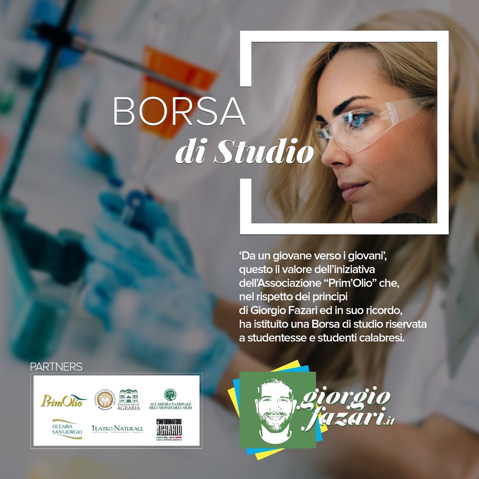 ‘Da un giovane verso i giovani’, questo il valore dell’iniziativa dell’Associazione “Prim’Olio” che, nel rispetto dei principi di Giorgio Fazari ed in suo ricordo, ha istituito una Borsa di studio riservata a studentesse e studenti calabresi, di qualsiasi ateneo, che nella regolare durata del corso, abbiano conseguito la Laurea Magistrale in discipline tecnico scientifiche in un ateneo italiano, con una valutazione non inferiore a 100/110.
