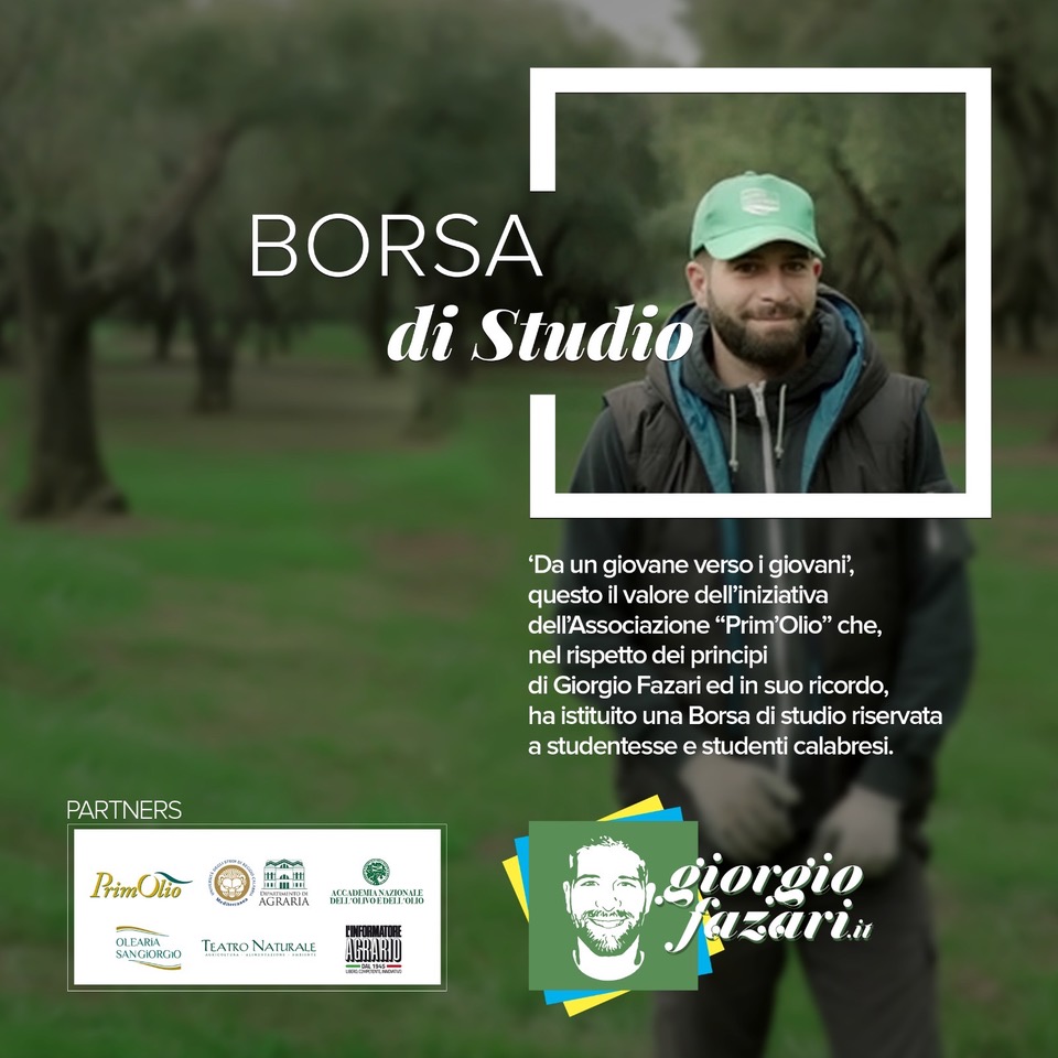 La borsa di studio, di € 2.000,00, sarà sostenuta dall’Azienda Olearia San Giorgio, impresa di famiglia del compianto Giorgio Fazari; di rilievo i partner a sostegno del progetto: Dipartimento di Agraria dell’Università degli Studi “Mediterranea” di Reggio Calabria, Accademia Nazionale dell’Olivo e dell’Olio, Teatro Naturale, Informatore Agrario.