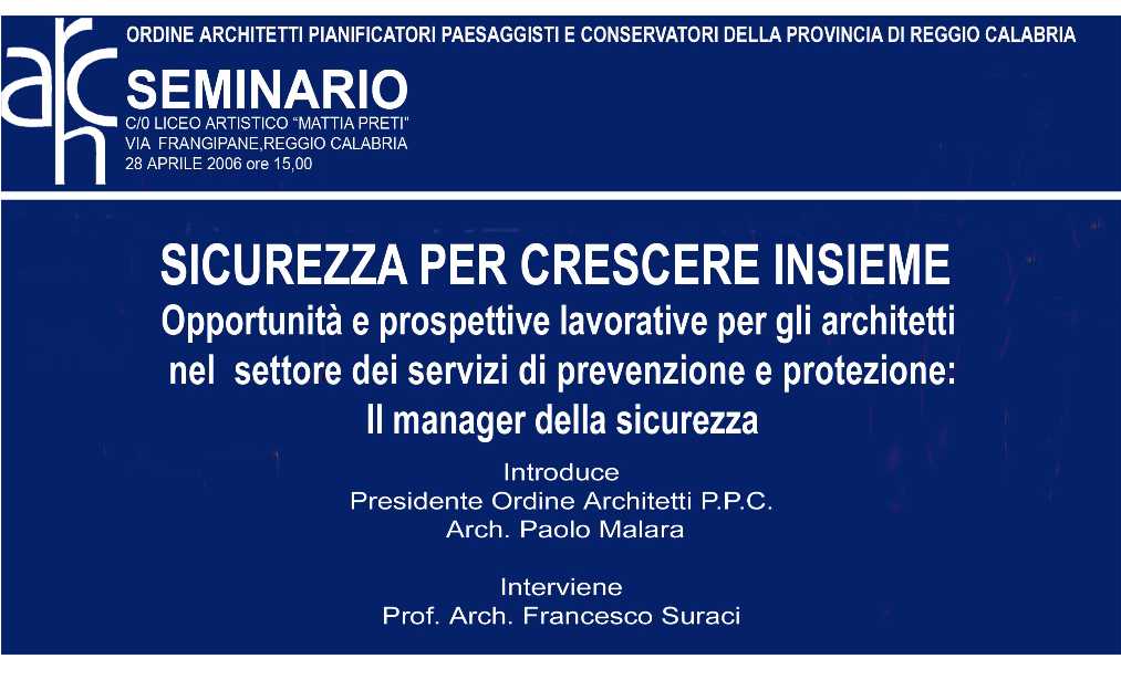 Promosso dall'Ordine degli architetti, pianificatori, paesaggisti e conservatori della provincia di Reggio Calabria il seminario dal tema: Sicurezza per crescere insieme Opportunità e prospettive lavorative per gli architetti nel settore dei servizi di prevenzione e protezione: Il manager della sicurezza. 28 aprile ore 15.00 presso il Liceo Artistico Mattia Preti in via Frangipane, 8 Reggio Calabria