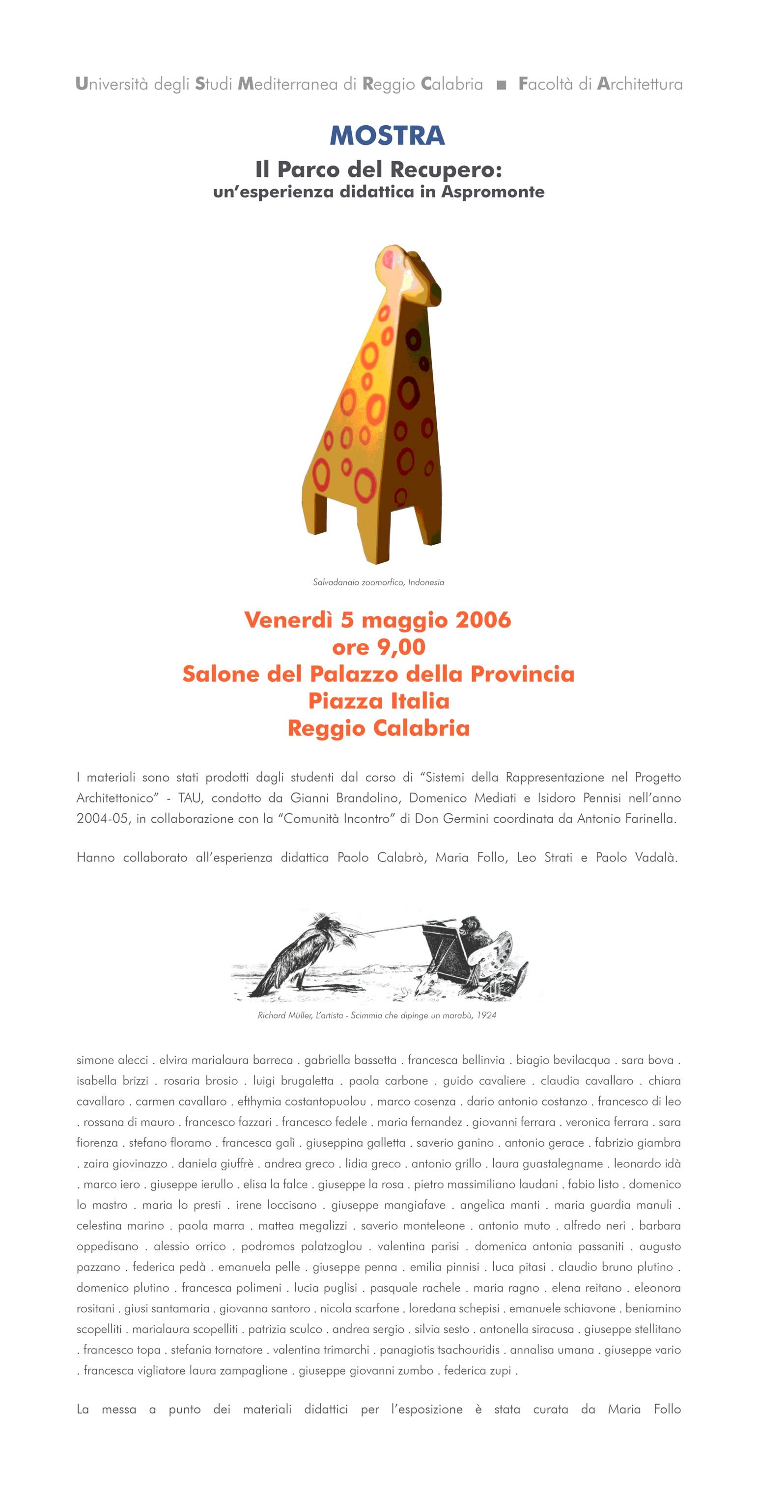 Per la sola giornata del 5 maggio il Salone della Provincia di Reggio Calabria ospita i lavori prodotti dagli studenti del corso di Sistemi della rappresentazione del progetto architettonico (TAU)della Mediterranea in collaborazione con la Comunità incontro di Don Gelmini. La locandina è in allegato.