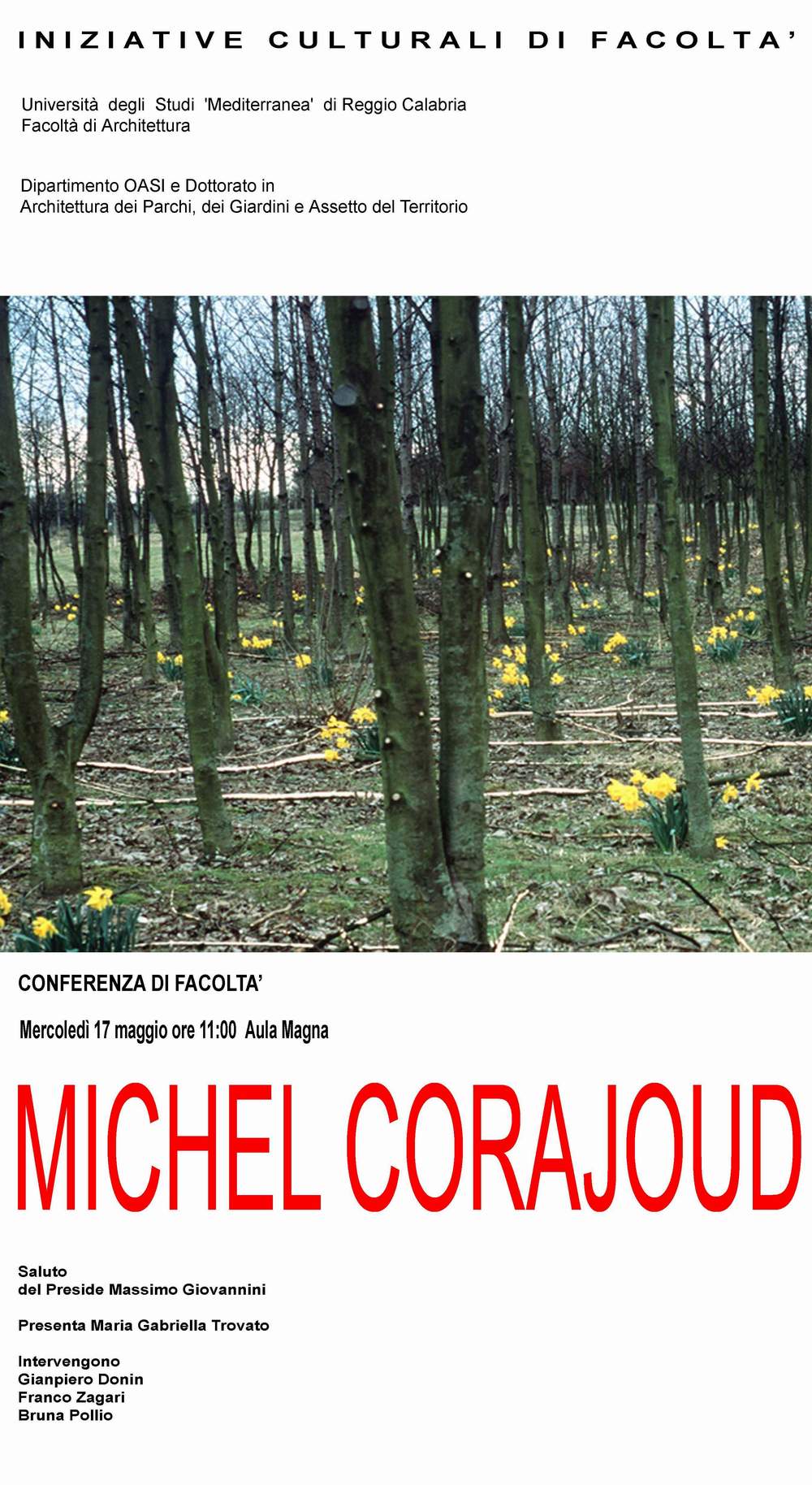 Mercoledì 17 maggio alle ore 11.00, nell'ambito delle Conferenze di Facoltà, presso l'Aula Magna di Architettura interverrà Michael Corajoud In allegato la locandina