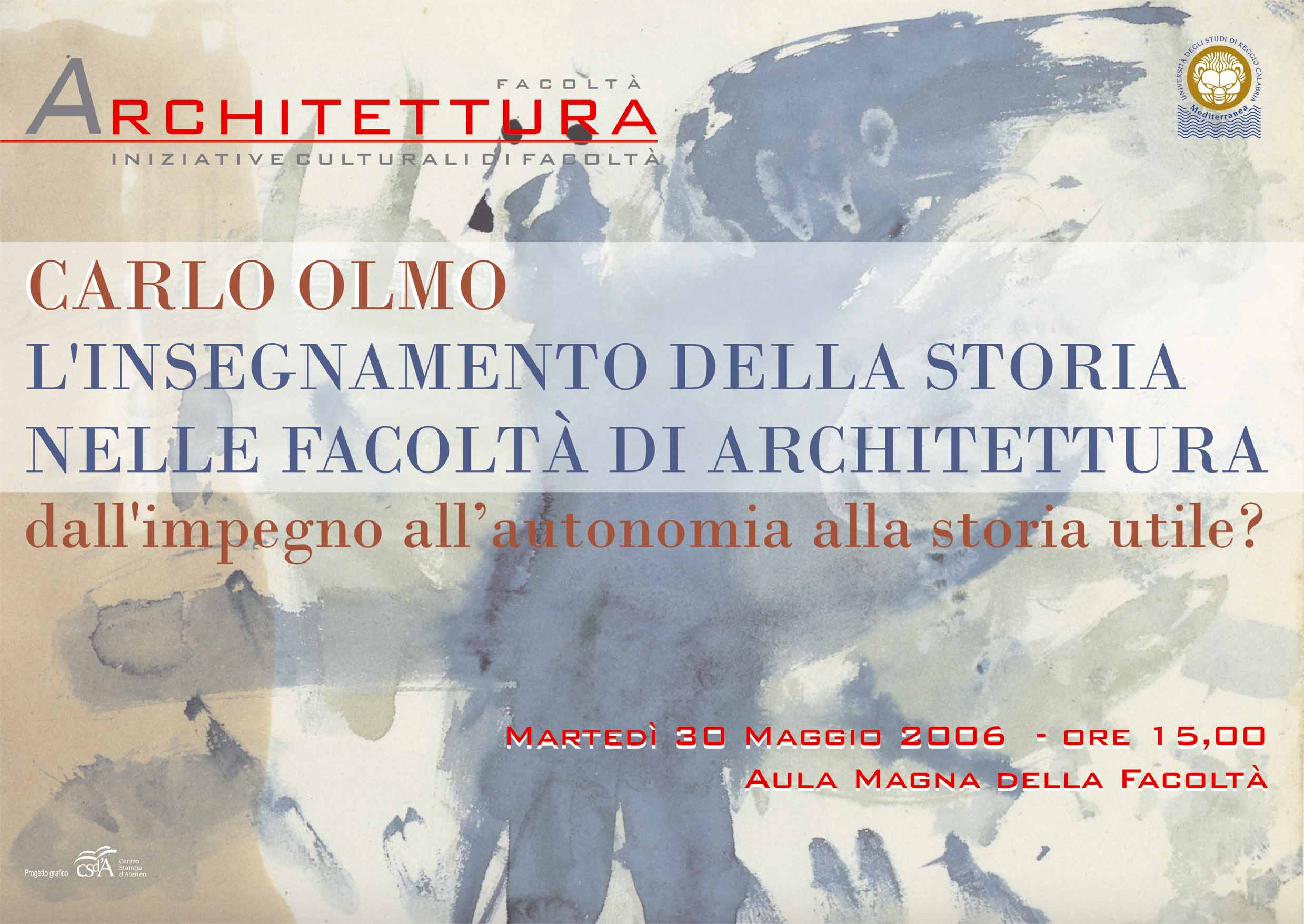 Aula magna facoltà di Architettura ore 15.00 Carlo Olmo parlerà sul tema L'insegnamento della storia nelle facoltà di architettura dall'impegno all'autonomia alla storia utile?