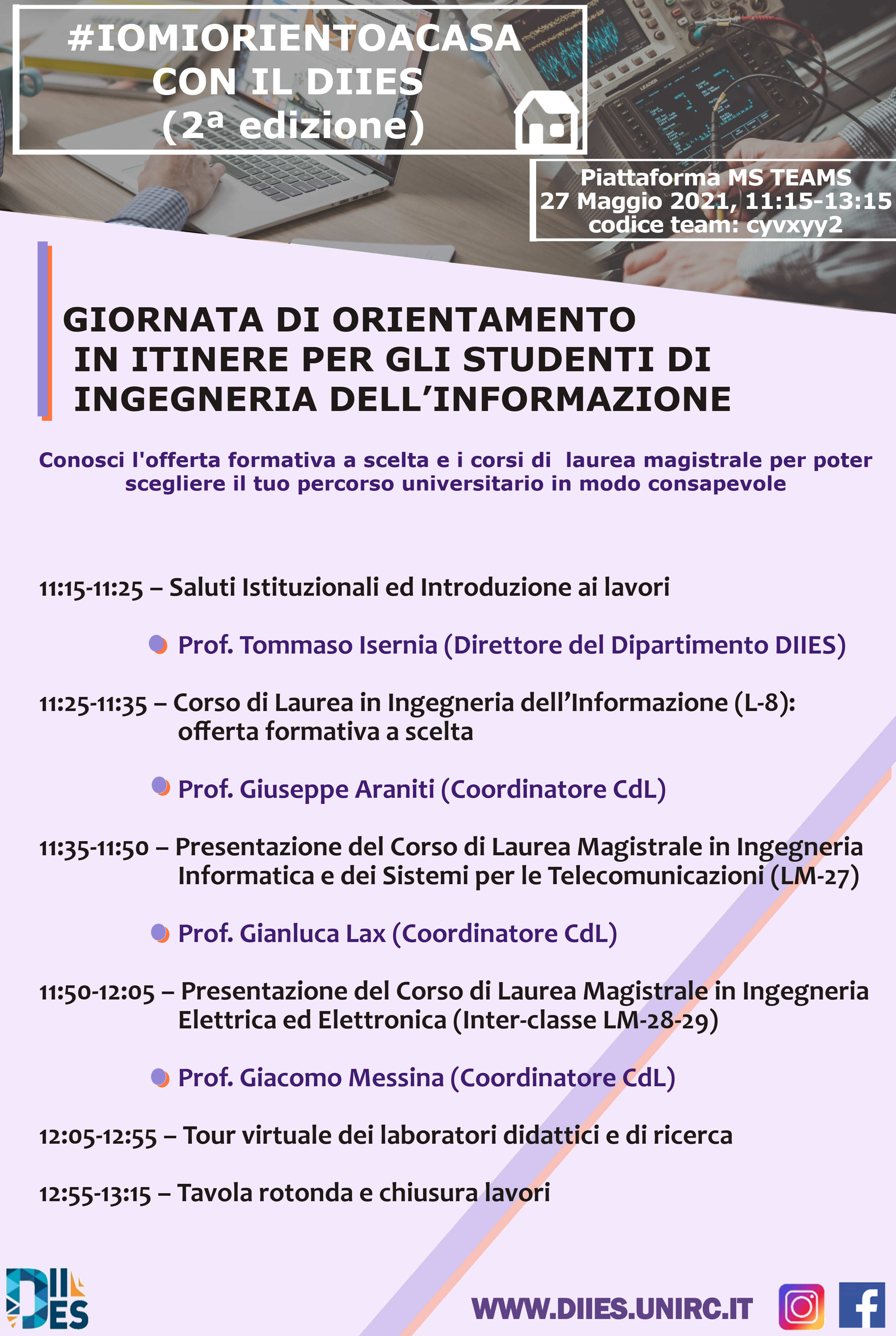 L’evento è promosso nel quadro delle attività di “orientamento in itinere” previsto dai corsi di laurea del DIIES, in particolare la laurea triennale in Ingegneria dell’Informazione e le lauree magistrali in Ingegneria Informatica e dei Sistemi per le Telecomunicazioni ed Ingegneria Elettrica ed Elettronica.
