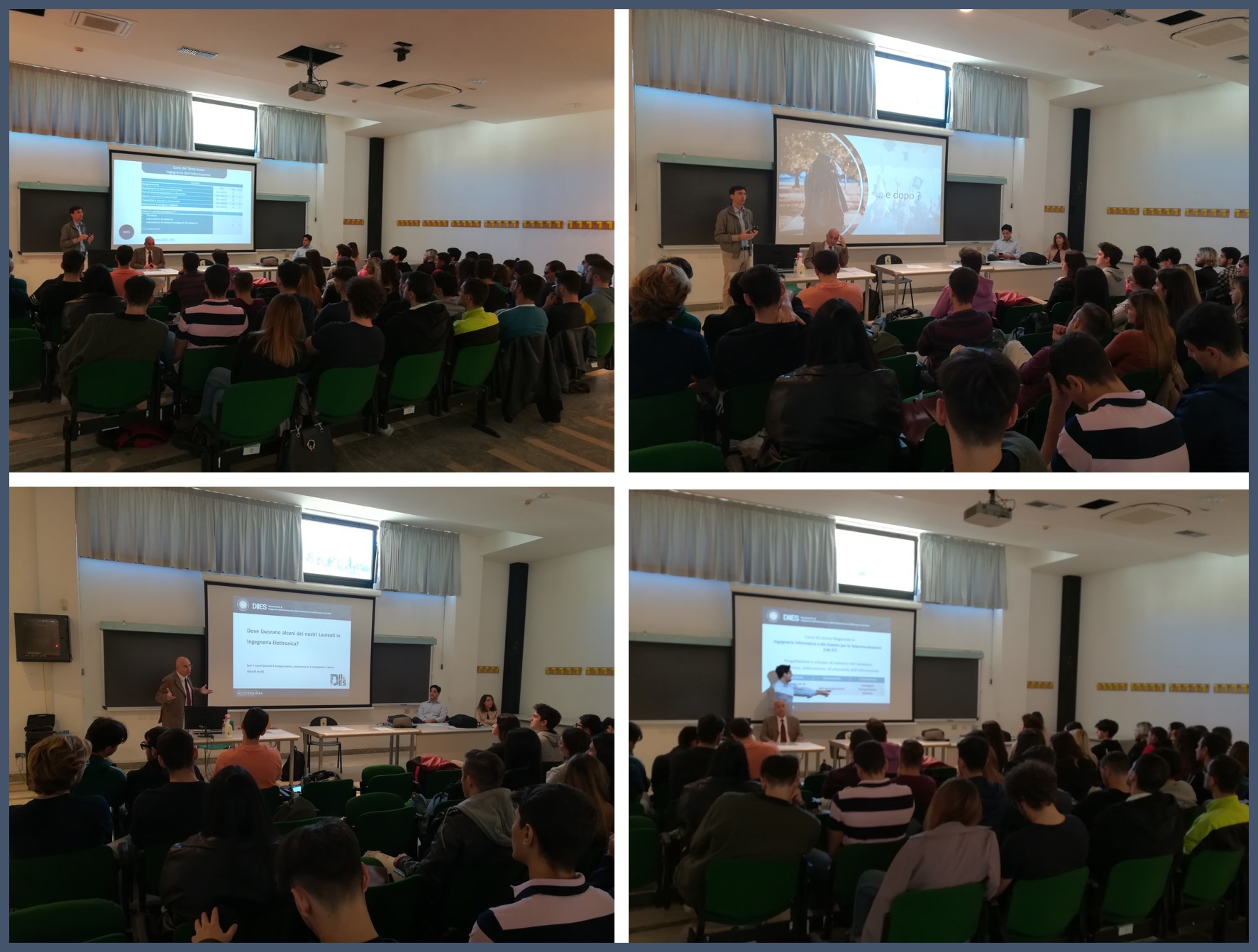 L'iniziativa, che ha visto la partecipazione di oltre 50 studenti, si è conclusa con una tavola rotonda durante la quale i Coordinatori, anche con il supporto della Dott.ssa Antonella Molinaro (Segreteria Didattica), hanno fornito delle risposte ai quesiti formulati dagli studenti presenti in aula e ad ulteriori suggerimenti/dubbi degli studenti raccolti mediante la somministrazione di un questionario on line.