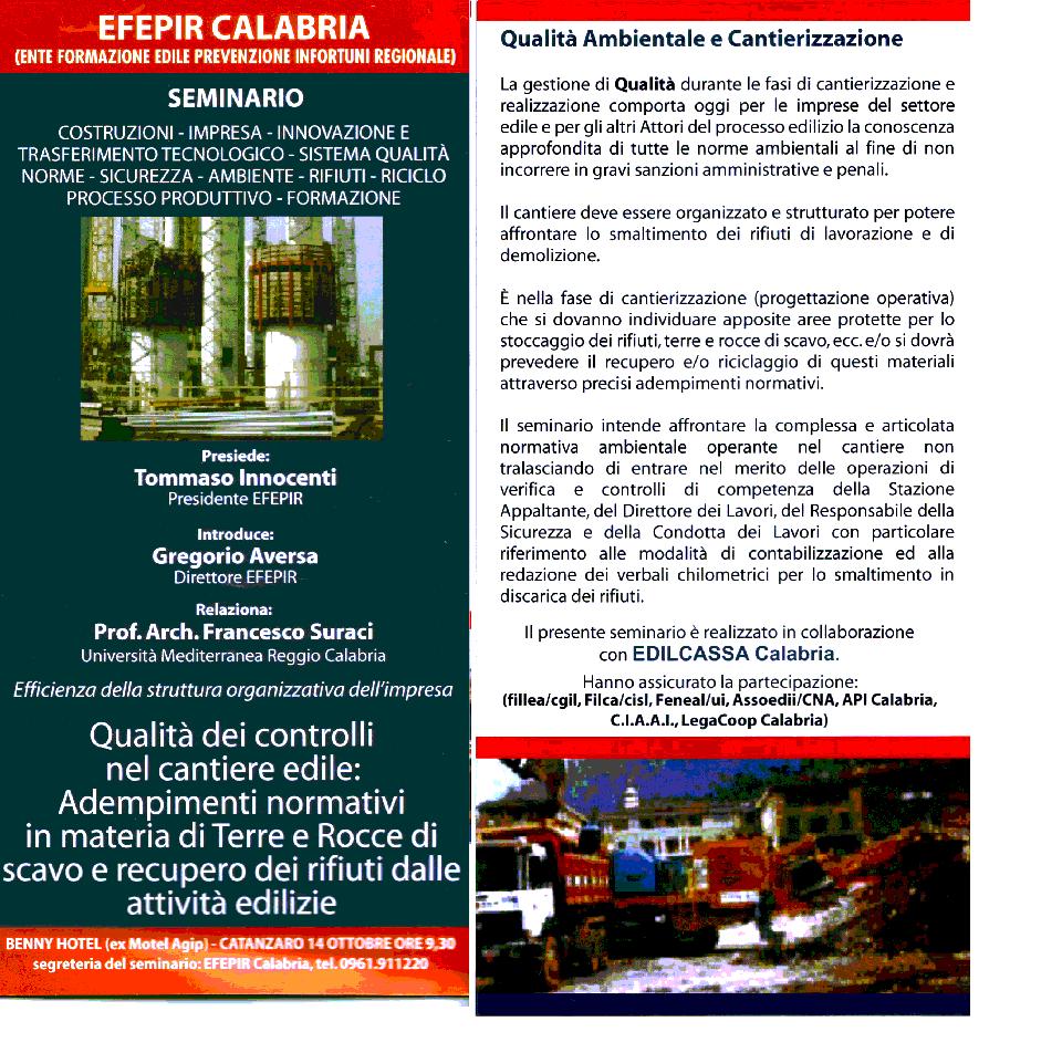 Nuove normative ambientali e smaltimento dei rifiuti da demolizione al centro dell’attenzione del seminario organizzato dall’EFEPIR CALABRIA per il giorno 14 ottobre con inizio alle ore 9,30 presso il Centro Congressi del BENNY HOTEL di Catanzaro. Il convegno rivolto alle imprese edili calabresi sara’ introdotto dal presidente dell’EFEPIR dott. Tommaso Innocenti e dal dott. Gregorio Aversa. La relazione base dal titolo: Qualita’ dei controlli nel cantiere edile: Adempimenti normativi in materia di Terre e Rocce di scavo e recupero dei rifiuti dalle attivita’ edilizie sara’ tenuta dal prof. Francesco Suraci, docente di Gestione Opere Pubbliche e Cantiere e Progettazione Esecutiva e Cantierizzazione presso l’Universita’ Mediterranea